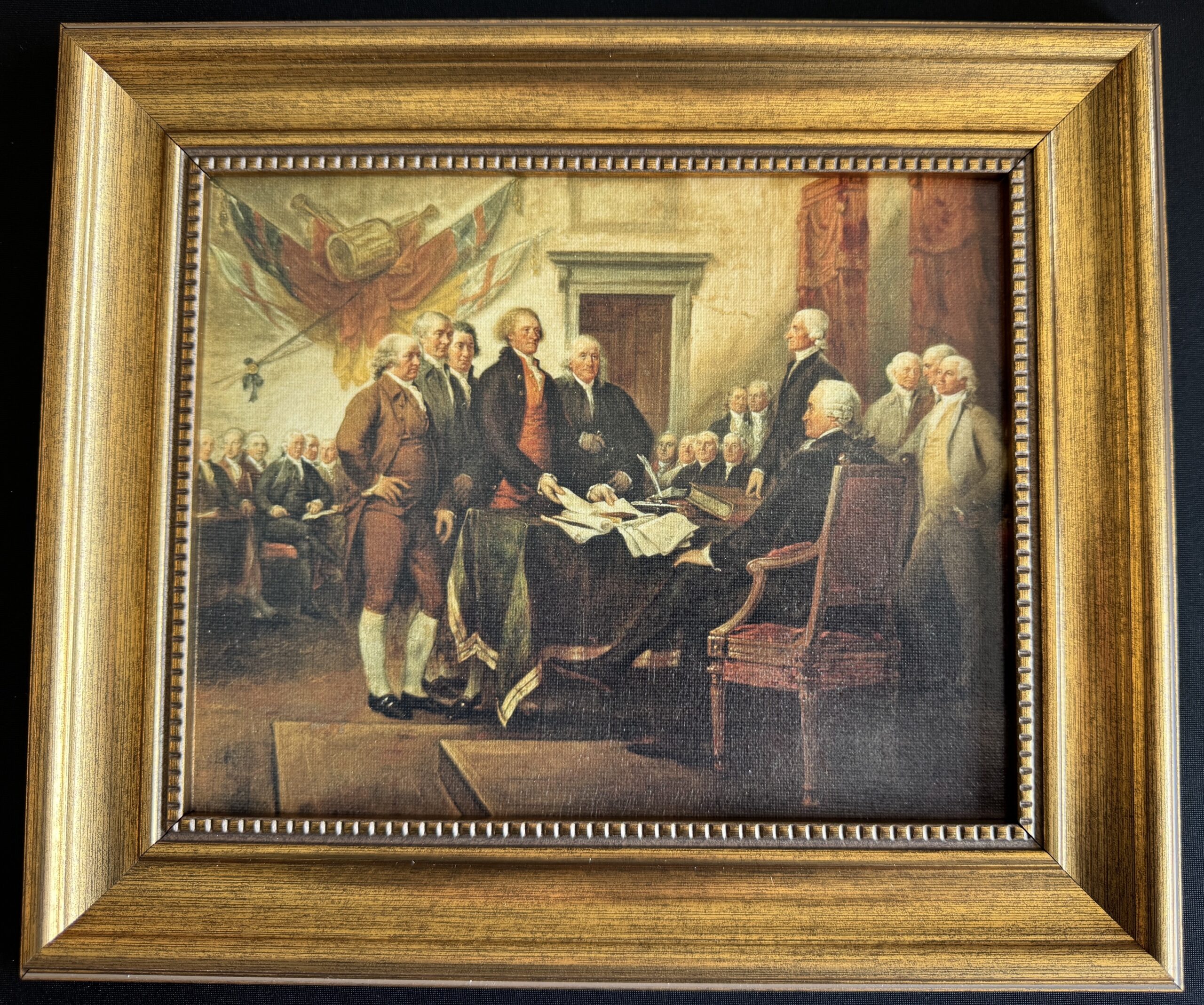 Experience a defining moment in America’s founding with this beautifully framed reproduction of John Trumbull’s Declaration of Independence. Known as the “Painter of the Revolution,” Trumbull spent decades capturing the faces and ideals of the nation’s earliest leaders. This iconic scene—now immortalized in the U.S. Capitol Rotunda—depicts the presentation of the draft Declaration in 1776, rendered with remarkable historical detail and artistry. Elegantly framed and perfectly sized, it offers a timeless window into the spirit and vision of the early Republic.