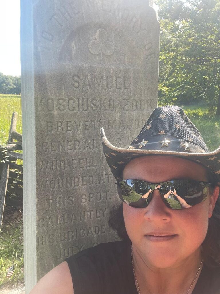 Growing up so close to the Gettysburg Battlefield, it was more my backyard than my own backyard. When I was 9, we were studying the Civil War and of course a trip to the Battlefield was put on the calendar. I will never forget my first visit to the former Visitor Center in the 1990s before it has been relocated and reconstructed to the much grander scene that it is today. On display in the museum was a frock coat with bullet holes in it, and the caption read “Gen. Samuel K. Zook shot on July 2, 1863, on the Wheatfield of Gettysburg” I remember asking my mother if we were related to him and she told me I would have to ask my daddy when we got home. This turned into a father daughter genealogy project! Turns out we are related. Ever since knowing that I have ancestral blood that died on the Battlefield of Gettysburg I have been avidly researching the Battle and cannot stop. Our cousin has a monument to honor his sacrifice on the Wheatfield that can be seen today. It has become a study place for me, my family knows you will often find me with a book sitting on the rock in the Wheatfield.