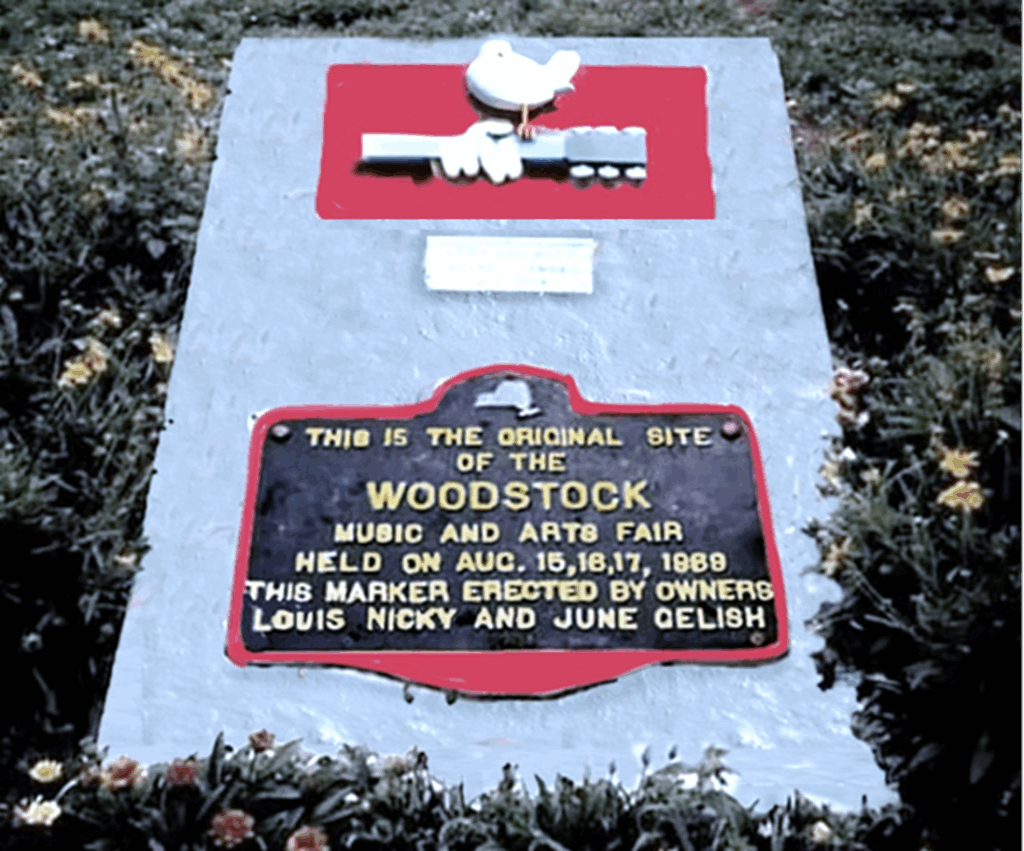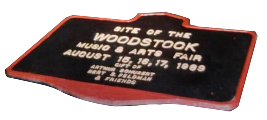 The monument pictured below is the 2nd incarnation of the marker. The artist, Wayne Saward, has his signature tag on a Belgian block embedded directly underneath the Woodstock logo. The Woodstock logo was designed by artist Arnold Skolnick as a promotional poster for the festival. Wording was also revised on the large plaque. The bottom of the plaque now says: THIS MARKER ERECTED BY OWNERS LOUIS NICKY AND JUNE GELISH, who purchased the farm from Max Yasgur’s estate. The large plaque was placed onto the monument before the 2 medium sized plaques were added underneath the Woodstock logo, and to each side of the artist’s tag at a later date