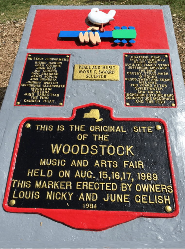The current, and 3rd incarnation of the marker is seen on the monument below, after receiving 2 medium sized side plaques with 27 out of the 31 performers who played at the Woodstock festival. It was lowered into a large hole on the hill overlooking the festival field, where it remains to this day. It’s also painted and repaired annually.
