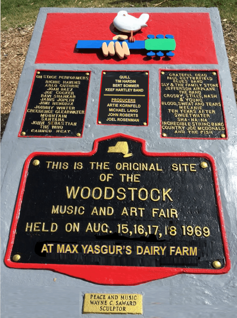 Here are photos of the original marker commemorating the Woodstock Music & Art Fair, which took place in Bethel, NY in August of 1969. There is currently a grassroots movement to have the 4 musical acts that were inadvertently omitted from the current monument (Quill, Tim Hardin, Bert Sommer, Keef Hartley Band) included on a separate plaque which is to be mounted in the center of the monument. It will also contain the names of the 4 young gentlemen who organized and produced the event: Artie Kornfeld, Michael Lang, John Roberts, and Joel Rosenman. Lastly, the property owner, Max Yasgur, who gave the organizers of the festival permission to hold the event on his dairy farm after they were snubbed twice by the town of Woodstock and the town of Wallkill respectively, is also due to be recognized.
