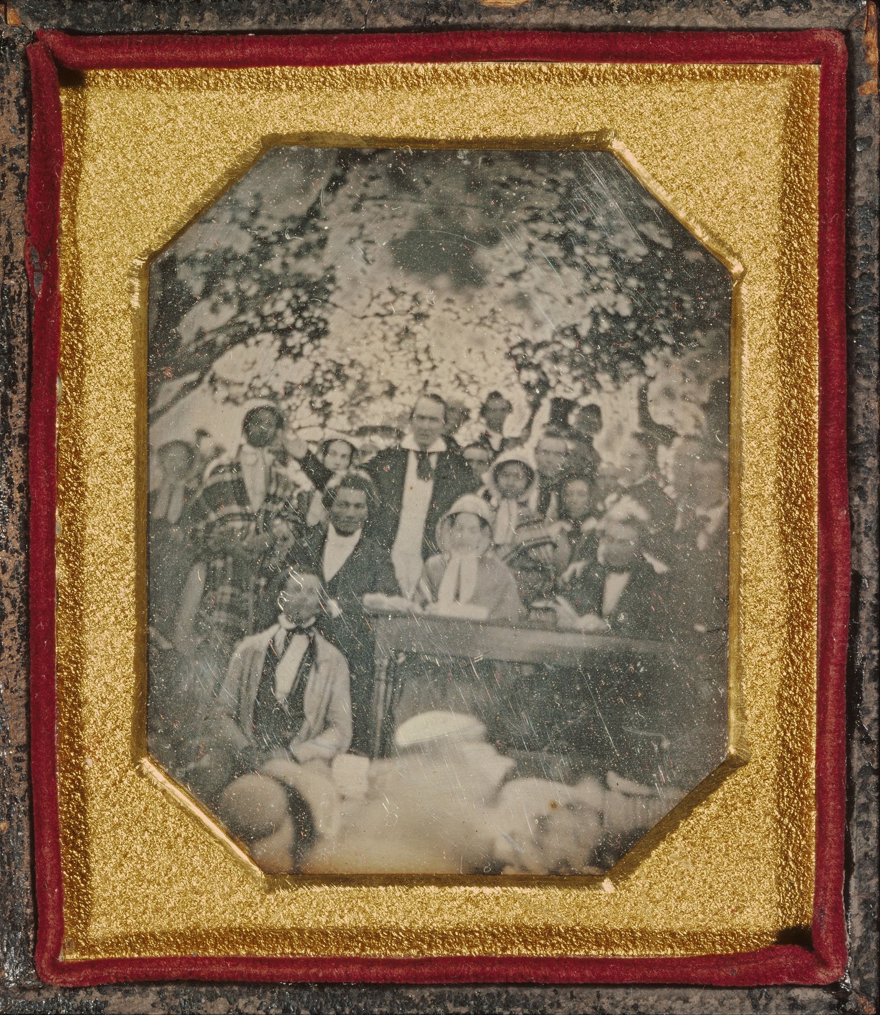 In the orchard of Grace Wilson’s school, abolitionists gathered under open skies to defy a law not yet passed but already feared. Douglass, seated at the table’s edge, presided over the largest known meeting of fugitive slaves in U.S. history. Gerrit Smith stands with arm outstretched, rallying the crowd. Days later, Congress would pass the Fugitive Slave Act — but here, in this grove, resistance was already blooming. The daguerreotype, intended for jailed abolitionist William Chaplin, became a lasting symbol of solidarity and defiance.
