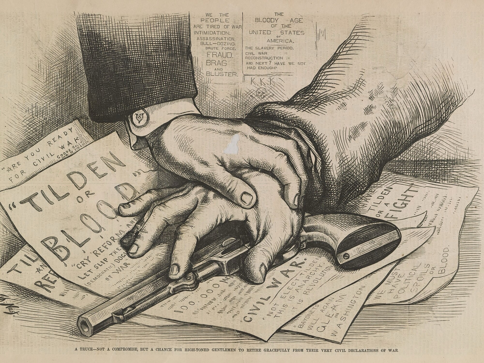 But outside the corridors of power, the nation simmered. The “TILDEN or BLOOD” cartoon, published amid the deadlock, captured the mood with brutal clarity: one hand clutches a pistol, the other a ballot, as slogans threaten civil war and invoke the ghosts of Reconstruction. The image is not subtle—it’s a warning. Americans were tired of fraud, force, and sectional strife, yet many feared the election might reignite it.