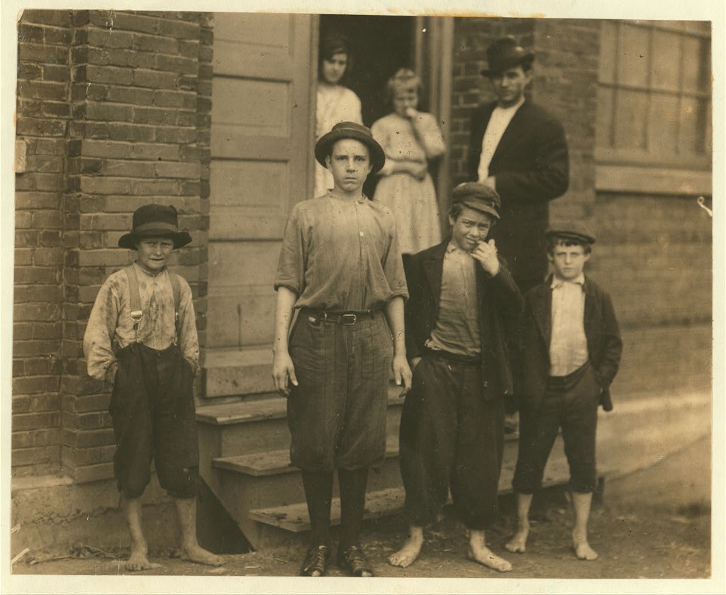 All these are workers at the Cherokee Hosiery Mill, Rome, Ga. Noon, April 10, 1913. The youngest are turners and loopers. Other Hosiery Mills around here employ children of 8 and 9 years. Some of these appear to be as young.