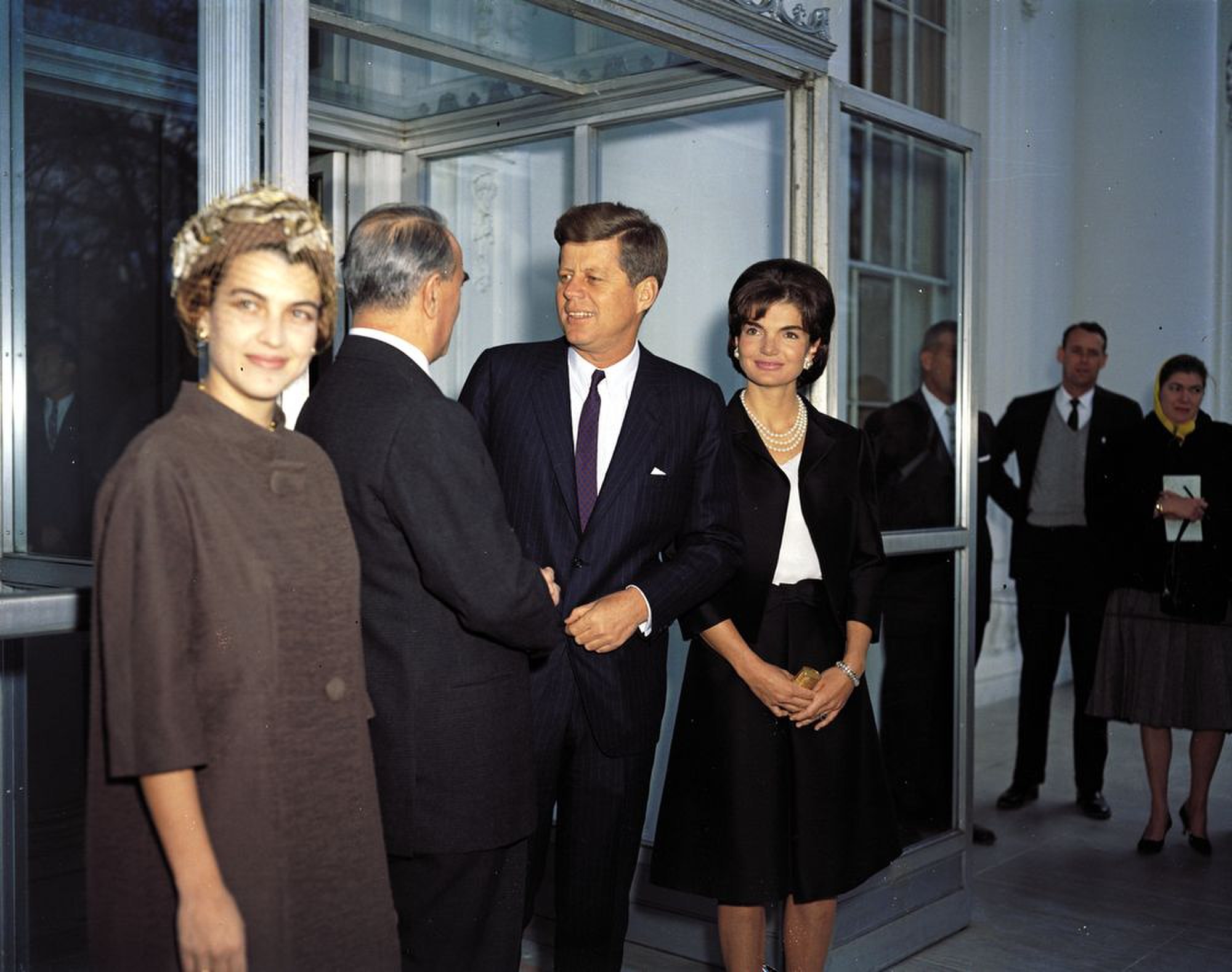 President John F. Kennedy and First Lady Jacqueline Kennedy greet Prime Minister of Greece Konstantine Karamanlis and his wife Amalia Karamanlis outside the North entrance of the White House, Washington, D.C..