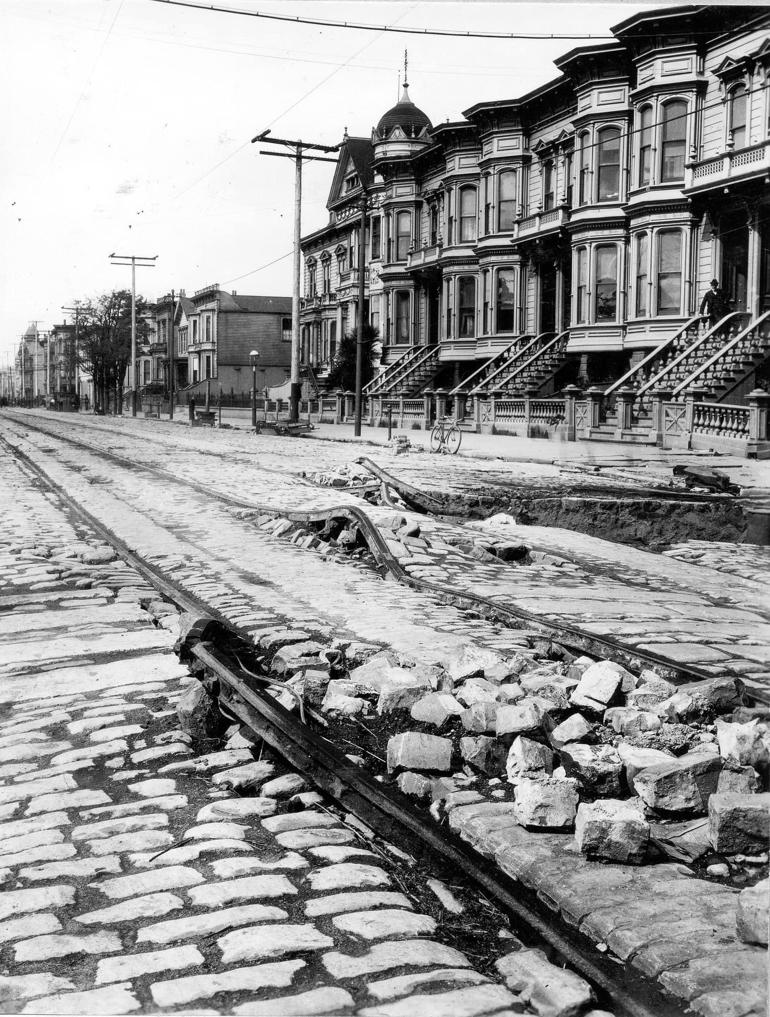 Bent streetcar rails and lifted stone blocks on a street in San Francisco, California after the earthquake occurred on April 18, 1906