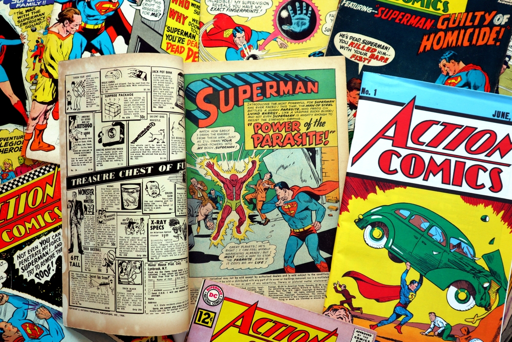 You can see most of the famous cover in this collage (on the right) with Superman lifting the green car.