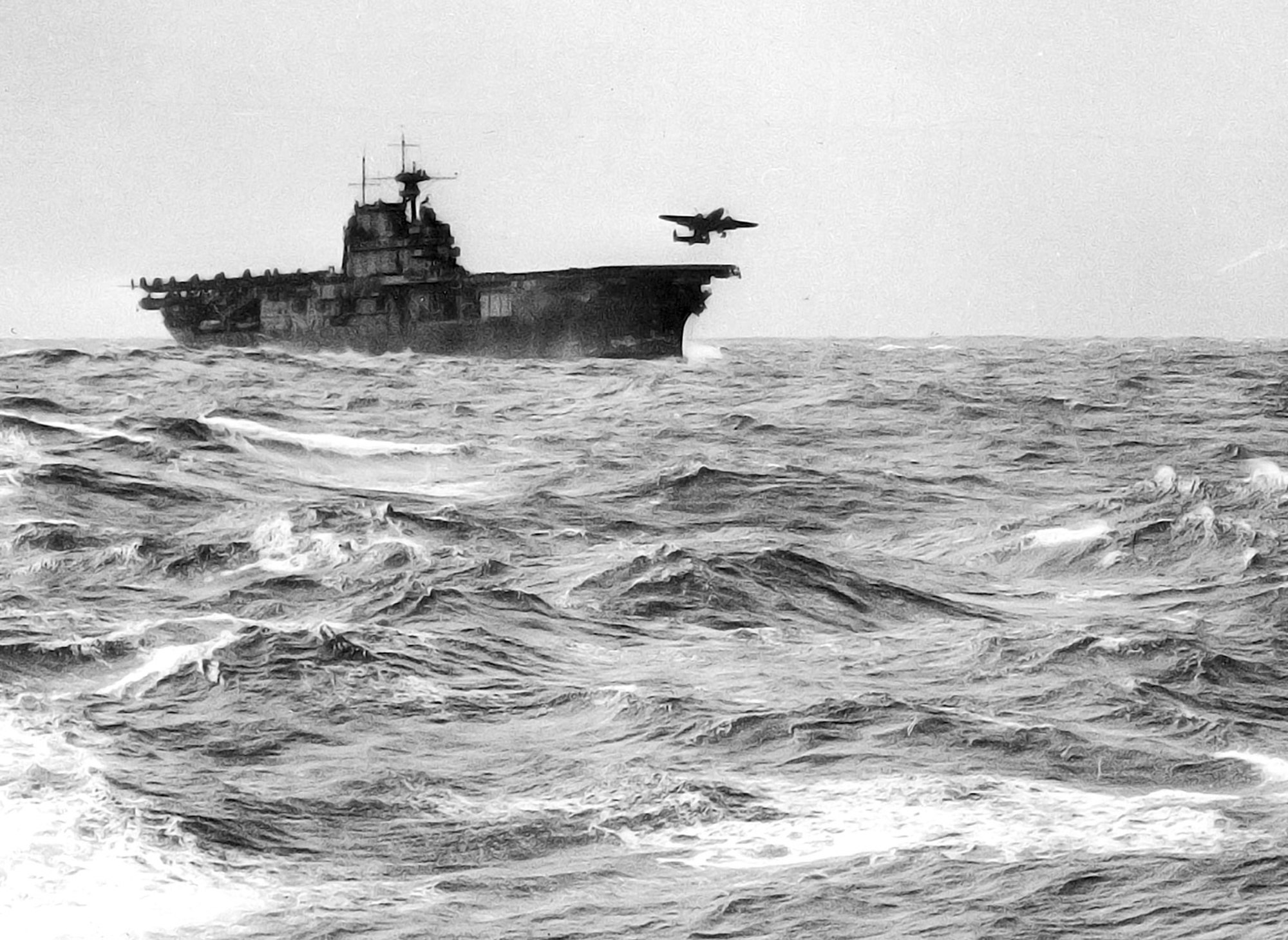 “U.S. Army Air Force B-25B Mitchell medium bomber, one of 16 involved in the Doolittle Raid, takes off from the flight deck of the USS Hornet for an air raid on Japan”