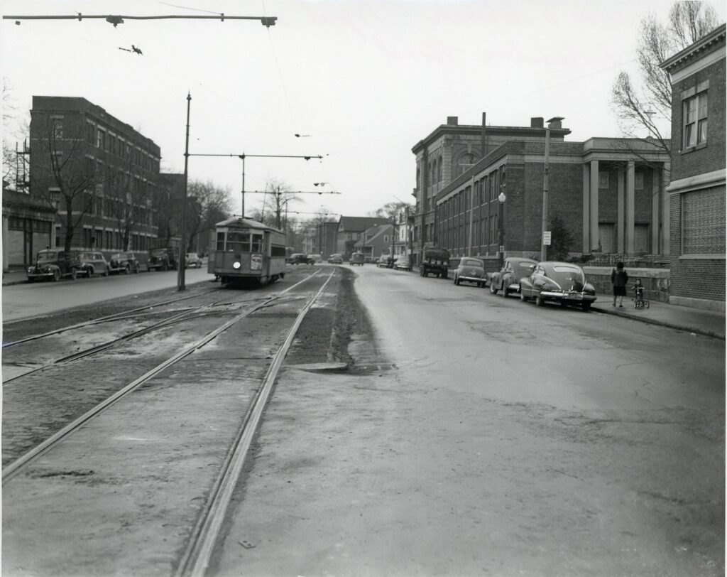 A route 16 trolley in front of Saint Kevin’s Church on Columbia Road, just south of Uphams Corner in Dorchester, Massachusetts on April 2, 1948 Image from Boston Public Works Department via Wikimedia Commons, CC BY 2.0