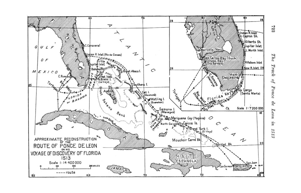 Reconstruction of the sailing route of Juan Ponce de Leon to Florida before making landfall on April 2, 1513. Image from 1913 via Wikimedia Commons, public domain