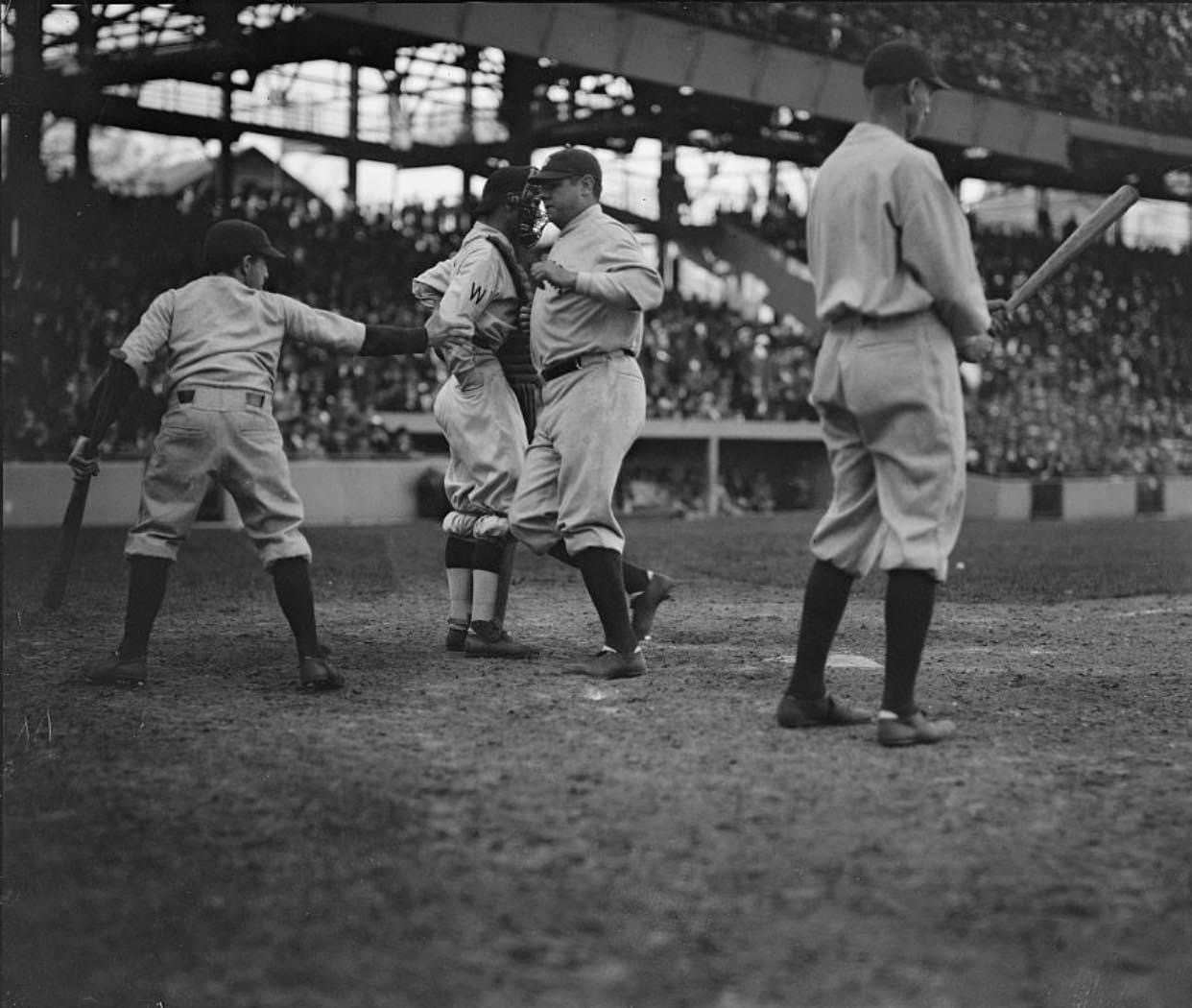 Babe Ruth scoring a home run against the Washington Senators on April 21, 1924