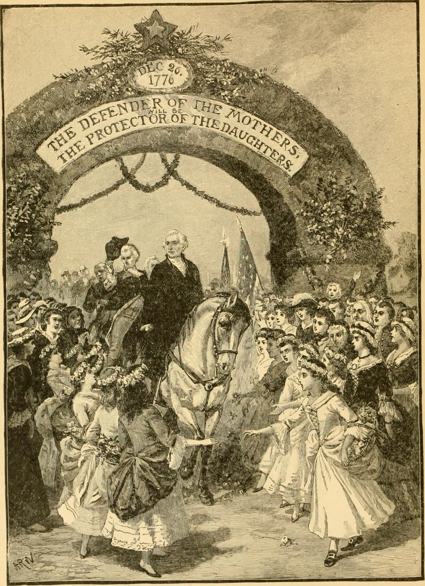“On his journey to New York Washington was met and escorted by crowds of people, who made his progress a march of triumph. At Trenton (April 21, 1789) a beautiful arch, decorated with flowers, spanned the road, commemorating his victory over the Hessians in 1776. His path was strewn with flowers, and troops of children sang songs of welcome.”