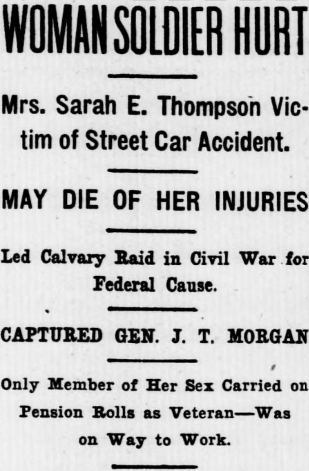 A former Union female spy named Sarah Elizabeth Lane Thompson was tragically struck by a vehicle on her way to work in Washington, D.C. on April 21, 1909. She is believed to have been the only female to receive a soldier’s pension at that time.