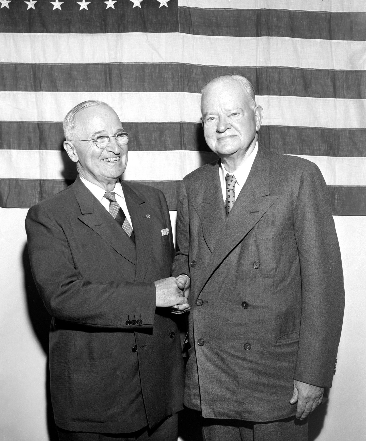Image of Ex-presidents Harry S. Truman, left, and Herbert Hoover shaking hands at the dedication of the Harry S. Truman Library in 1958 via Alamy