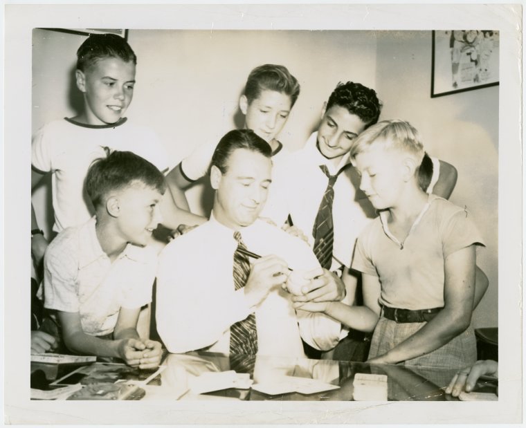 Lou Gehrig signing a baseball with a group of boys