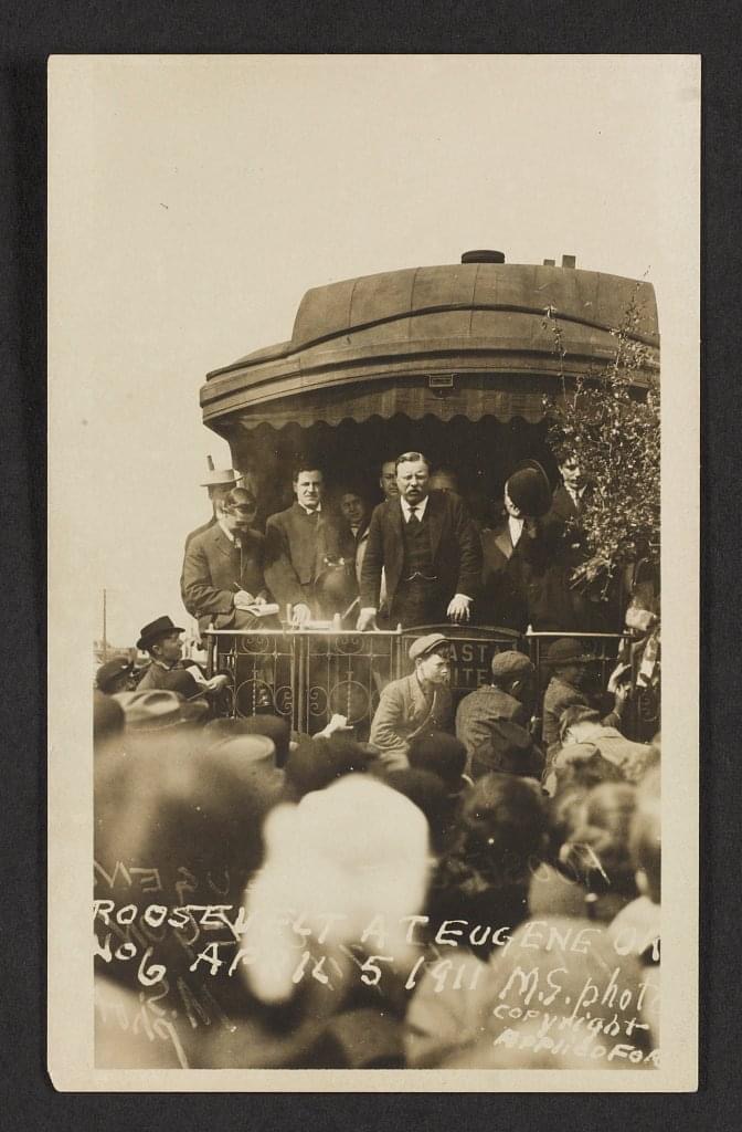 Theodore Roosevelt with others standing on back of train, facing crowd. Eugene, Ore. April 5, 1911