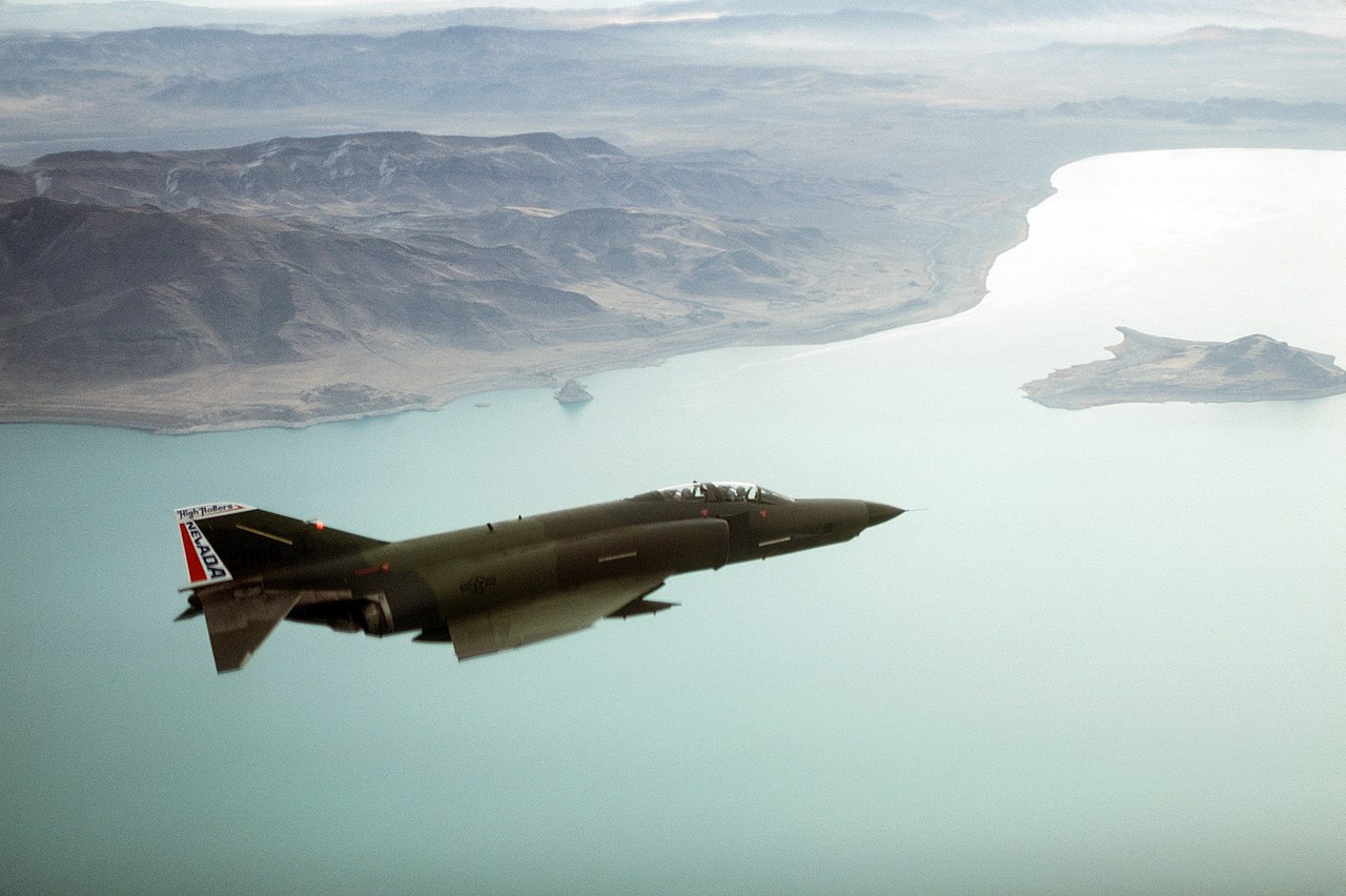 An air-to-air right side view of an RF-4C Phantom II aircraft of the 152nd Tactical Reconnaissance Group in flight over Lake Tahoe