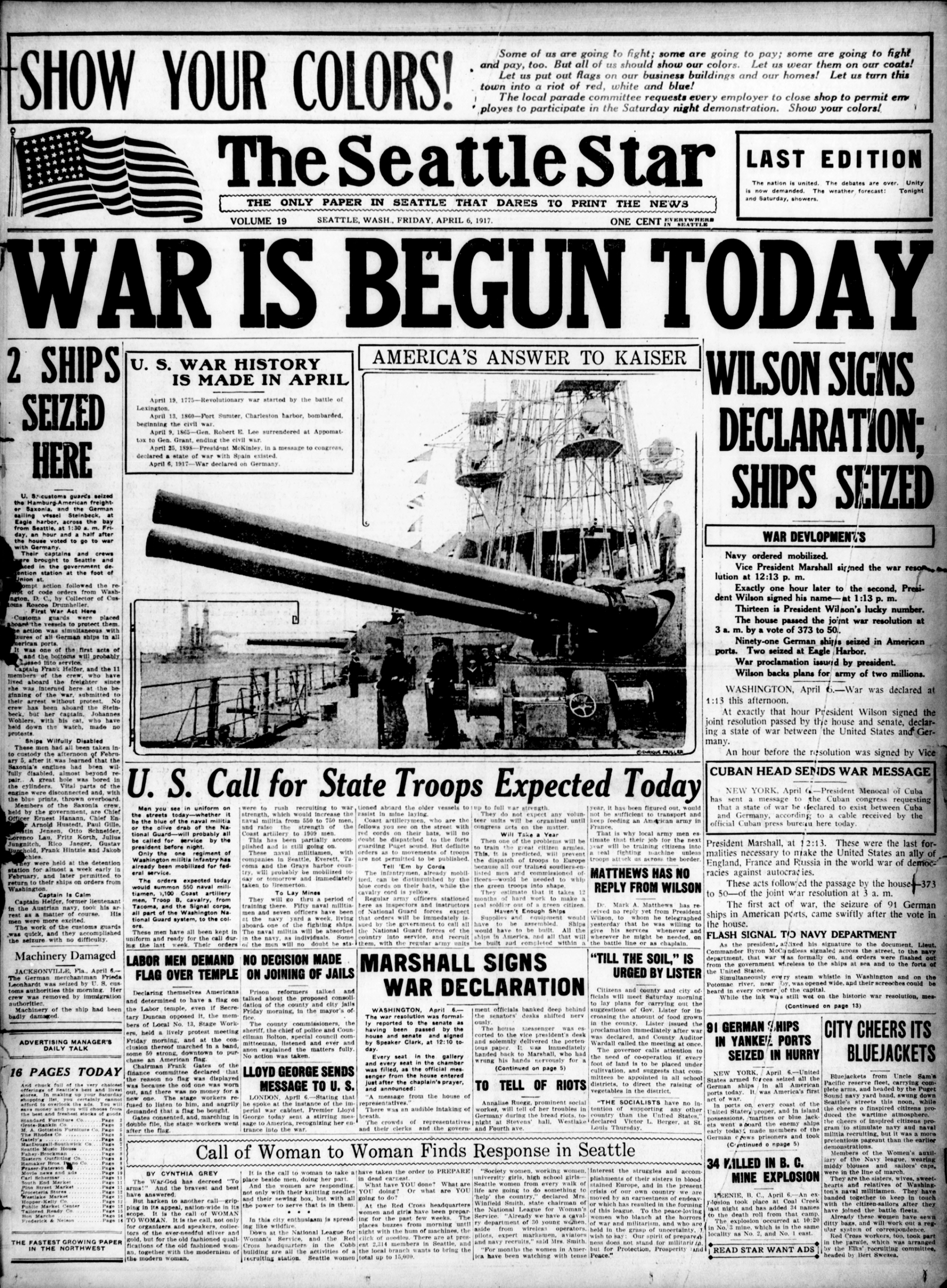 Front Page of the Seattle Star, April 6, 1917 announcing the U.S. entry into WWI