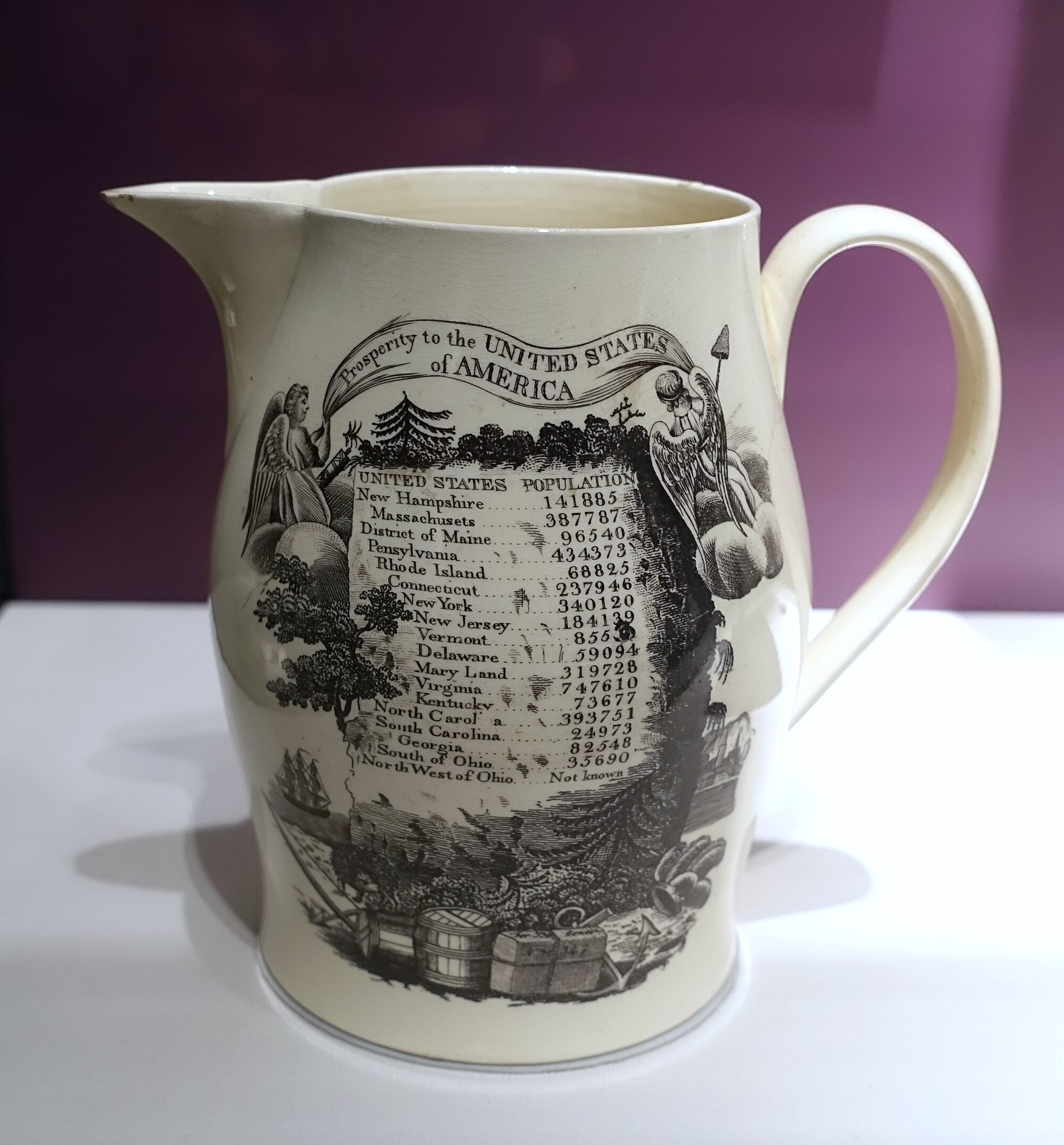 A pitcher that was made in England showing the population of the United States in 1790.