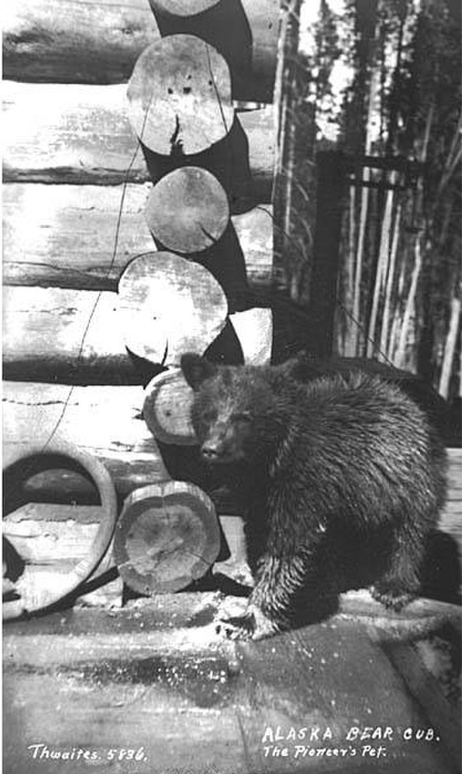 Image: A bear cub near a cabin in Alaska in 1912 via Wikimedia Commons, public domain