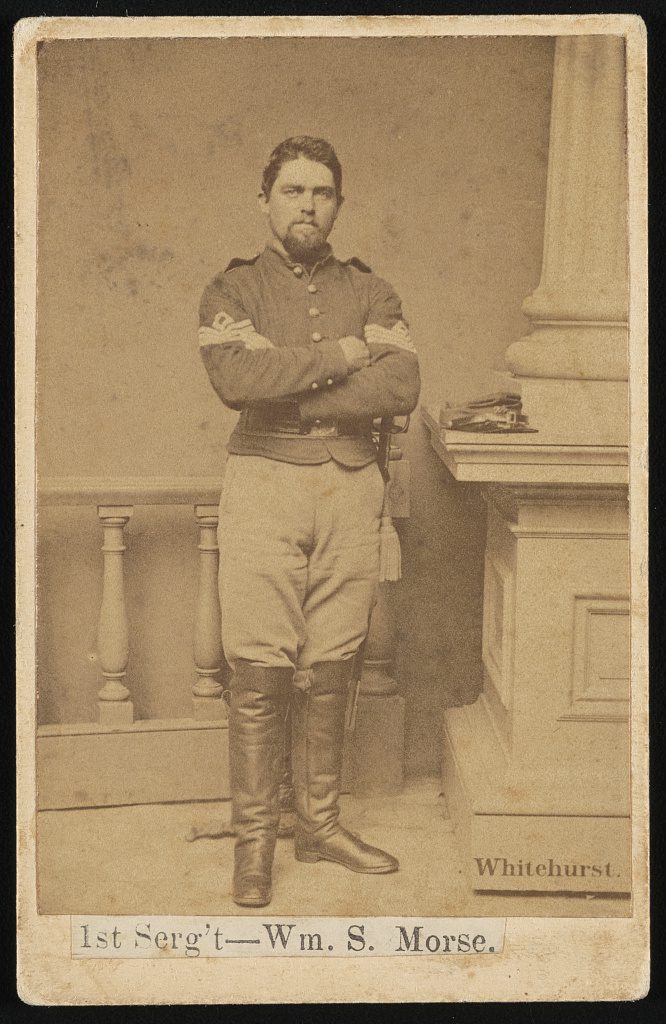 1st Sergeant William S. Morse in uniform with sword of Co. C, 24th New York Infantry Regiment who was injured at the Second Battle of Bull Run on August 30, 1862.
