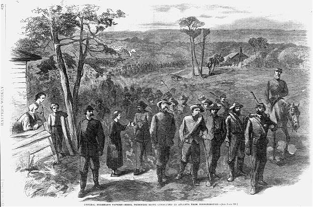 Image: an engraving of General Sherman’s victory – Rebel prisoners being conducted to Atlanta from Jonesborough by the 125th Illinois Regiment in Georgia via LOC, no known restrictions