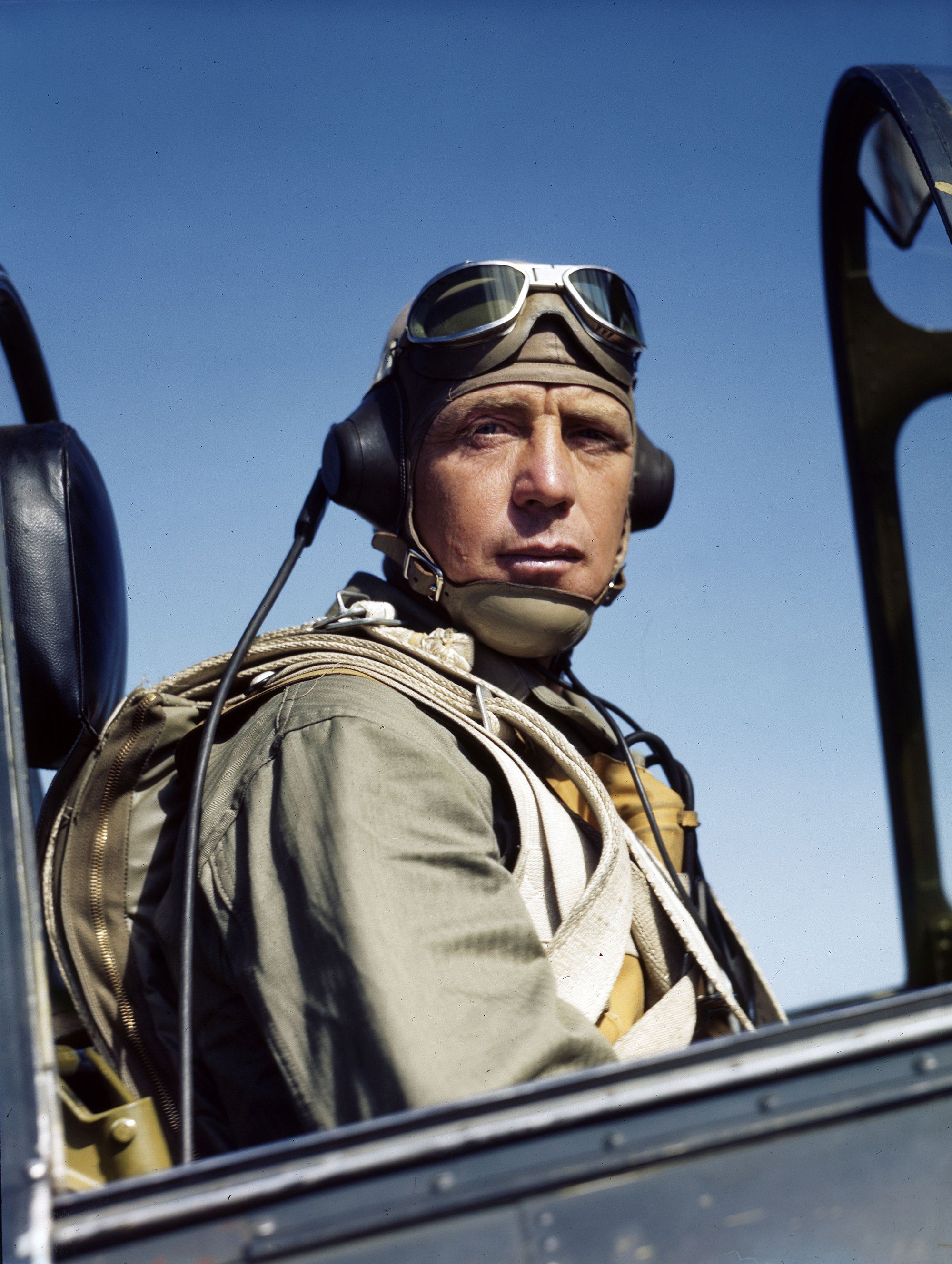 U.S. Navy Commander Charles L. Crommelin, in his Grumman Hellcat, about to launch from the USS Yorktown aircraft carrier for a raid on Marcus Island, August 31, 1943