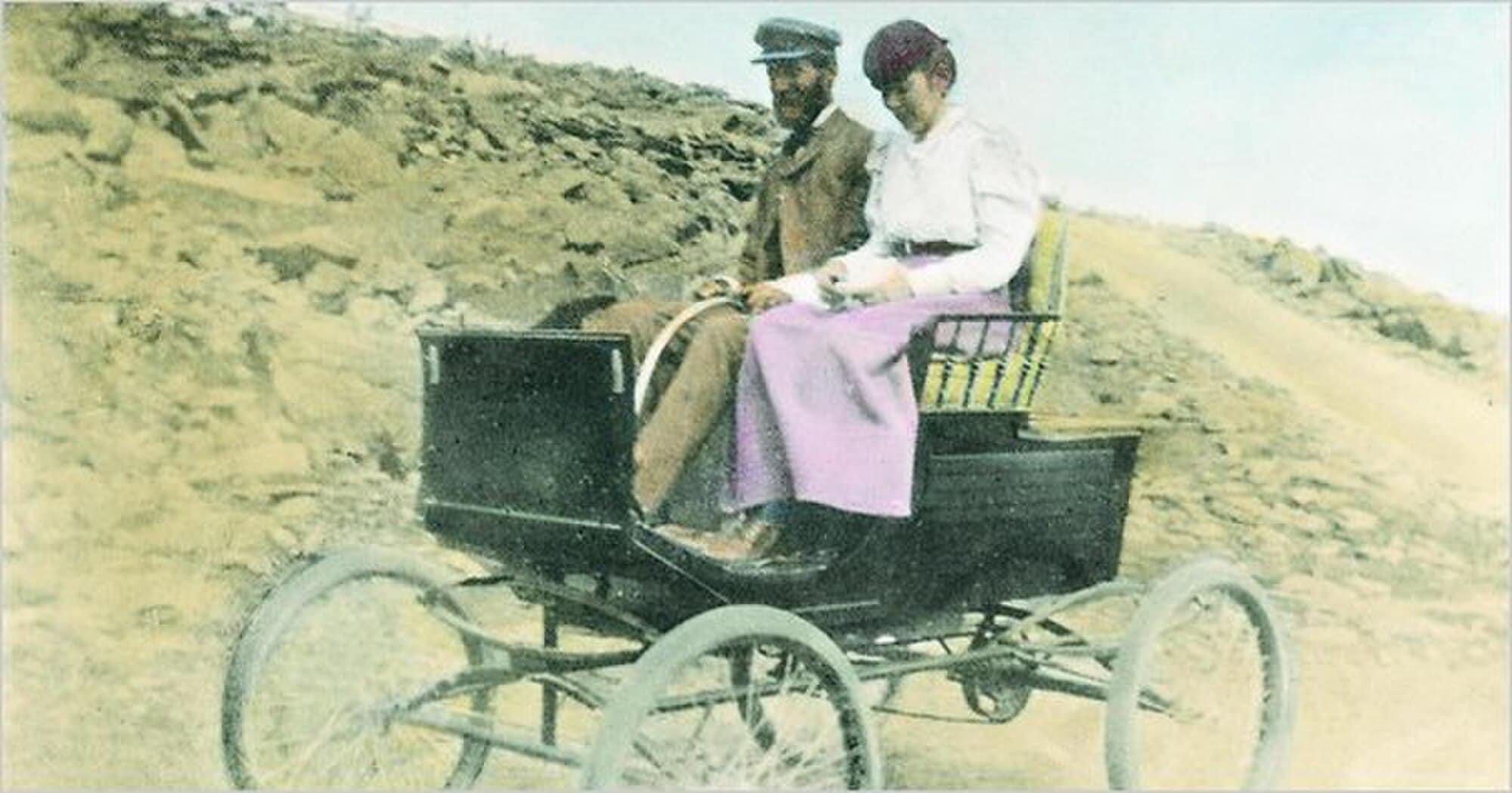 F.O. Stanley with his wife, Flora, in a Stanley steam powered automobile. They are shown taking their early automobile to the top of Mount Washington in New Hampshire, the first to do so by car.