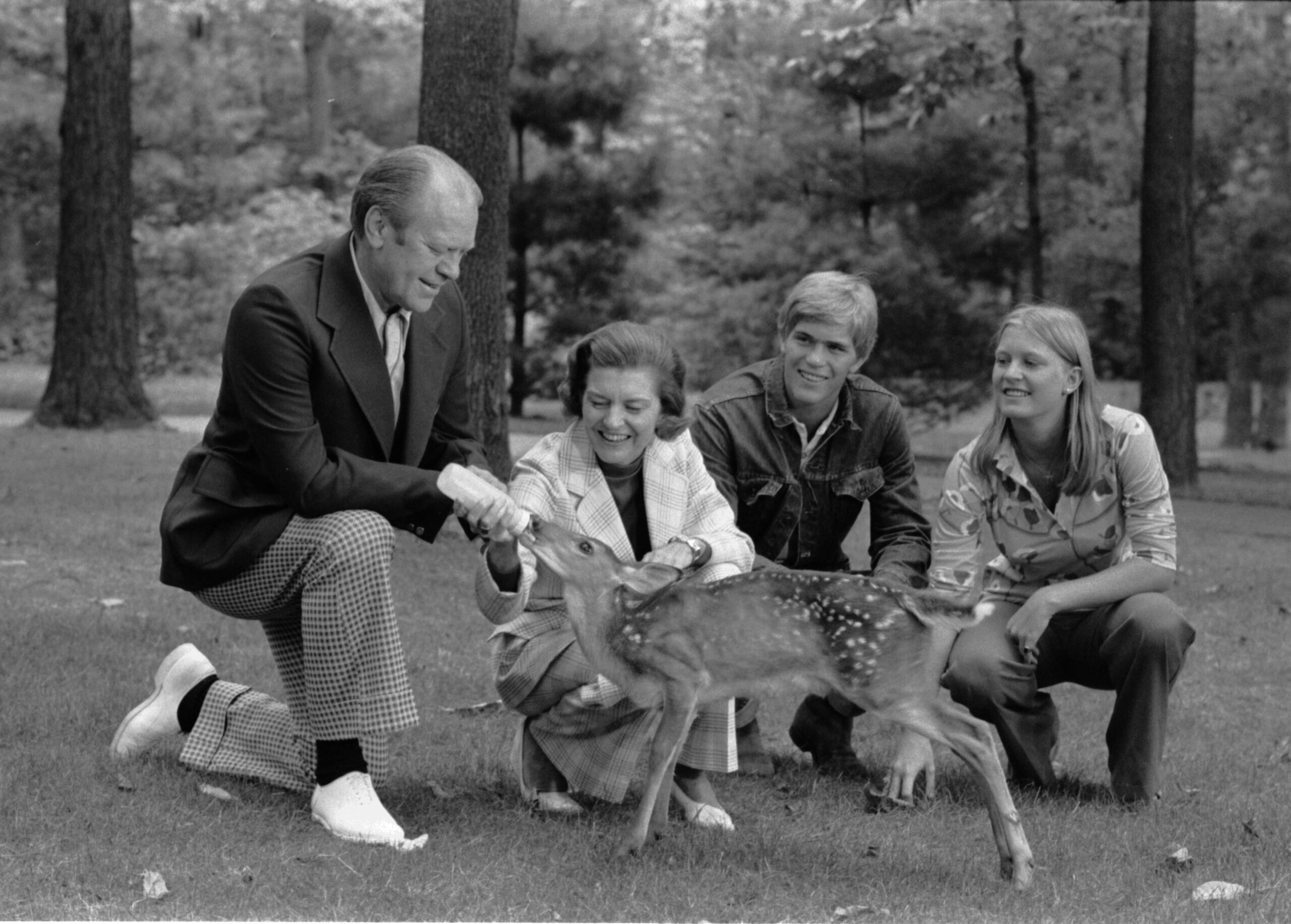 President Gerald R. Ford, First Lady Betty Ford, Steve Ford, and Susan Ford Feeding “Flag” the Deer at Camp David