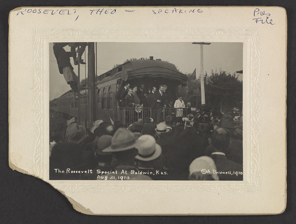 Image of Roosevelt on a train in Baldwin, Kansas on August 31, 1910 via LOC, no known restrictions
