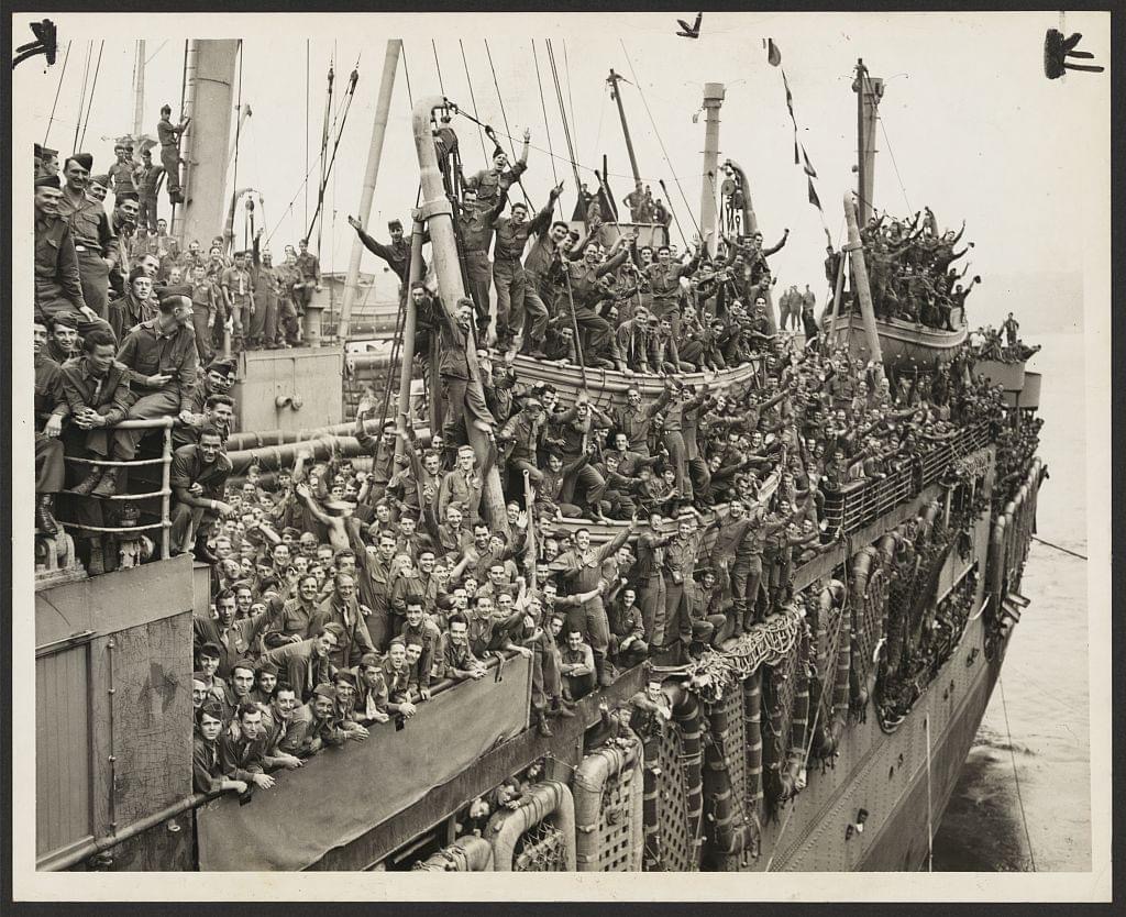 Troops of the 20th Armored Division and units of the 9th Army cheer as the SS John Ericsson nears Pier 84, North (Hudson) River in New York City