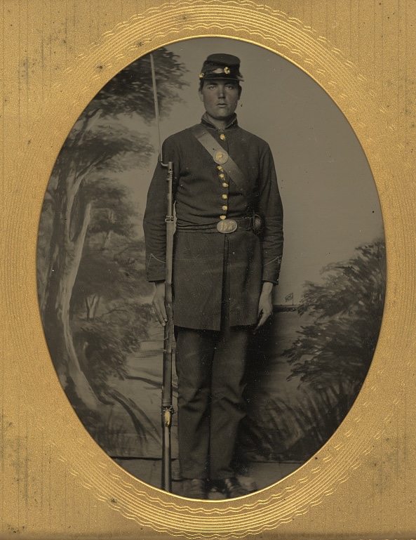 A marine stands in attention on the left just above the gun toward the background. Also above the gun, to the right is a cavalryman who is leaning on his saber. In the center of the image is a Union officer, surrounded by troops, who reaches toward the cannon as if in the act of firing. Image via Wikimedia Commons, public domain
