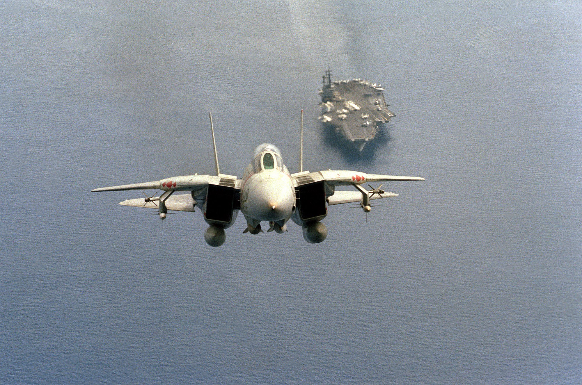 Image of F-14A Tomcat flying over the USS America in 1984 via Wikimedia Commons, public domain