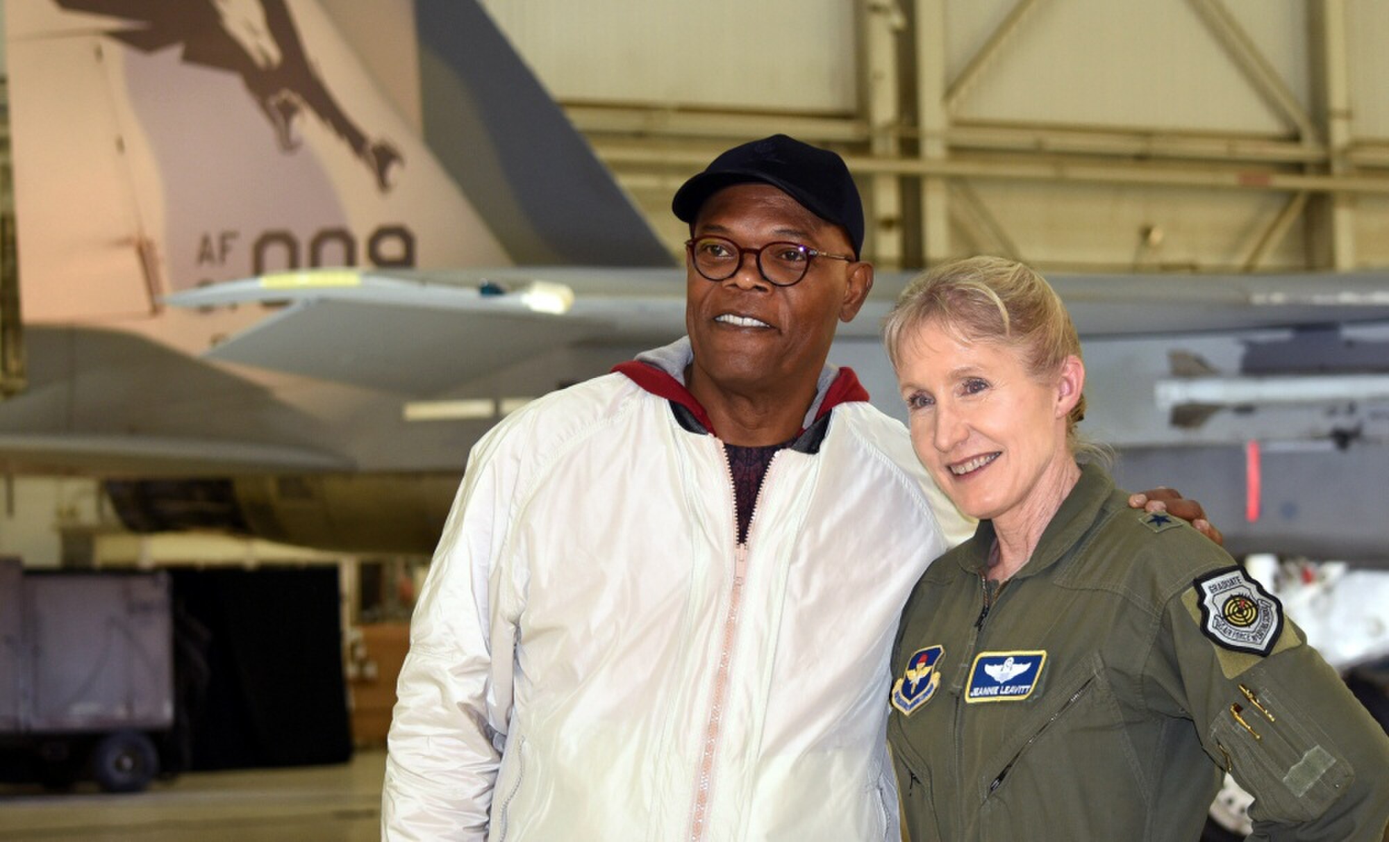 Image of Actor Samuel L. Jackson with the first female fighter pilot of the U.S. Air Force, Gen. Jeannie Leavitt at Edwards AFB in 2019 via Wikimedia Commons, public domain