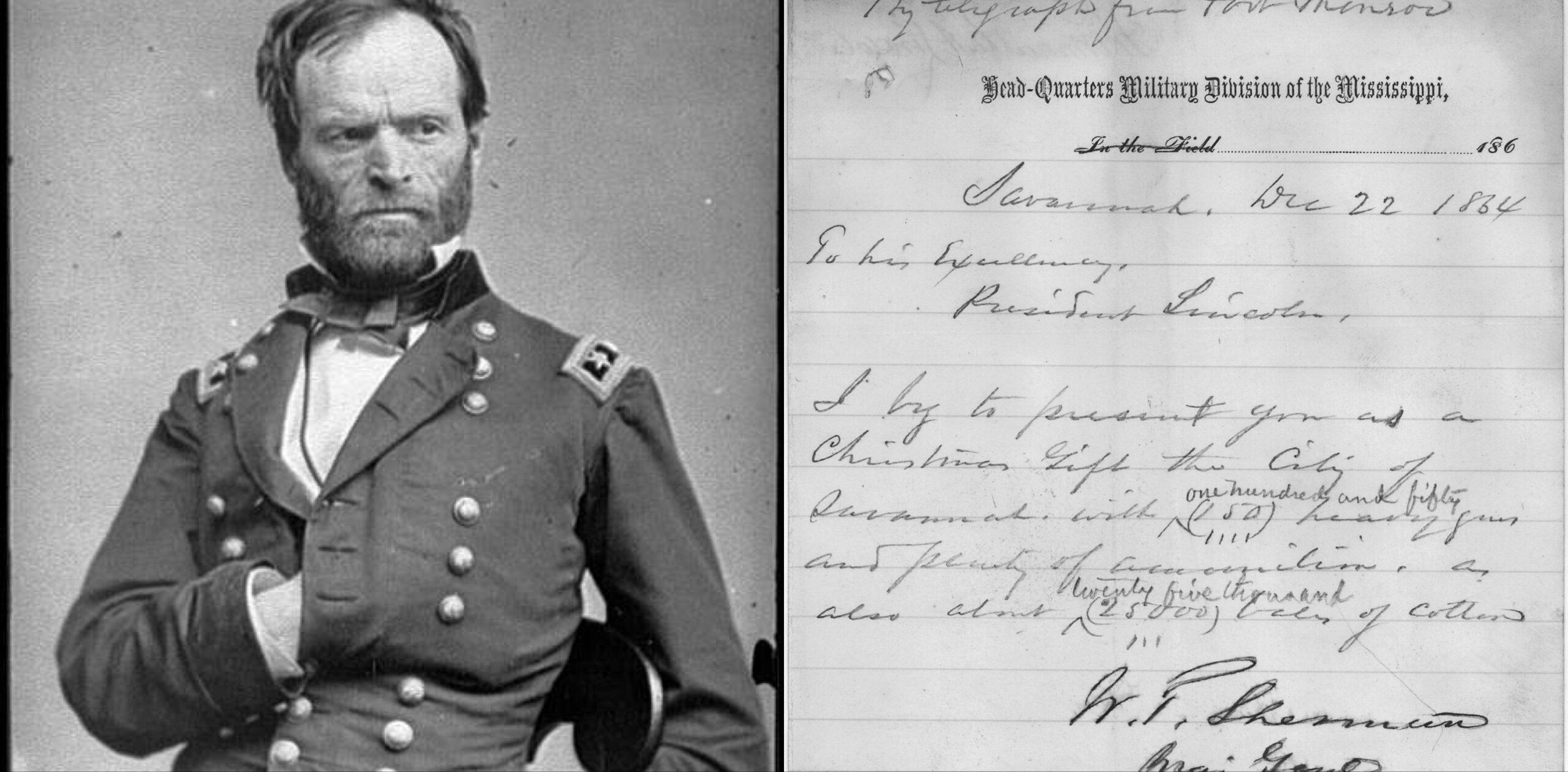 “I beg to present you as a Christmas gift the City of Savannah, with one hundred and fifty guns and plenty of ammunition, also about twenty-five thousand bales of cotton.”