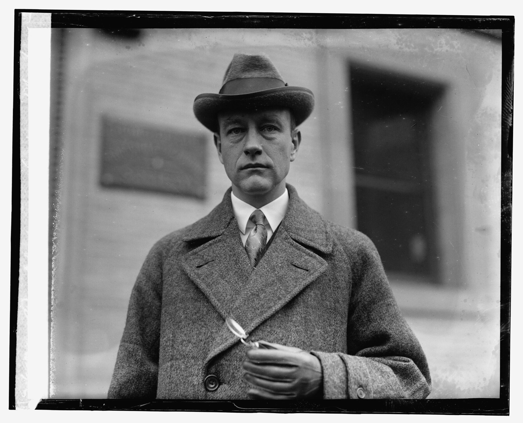 A photograph taken on December 22, 1923 of American explorer and naturalist Roy Chapman Andrews standing outside National Geographic Society Headquarters in Washington, D.C.