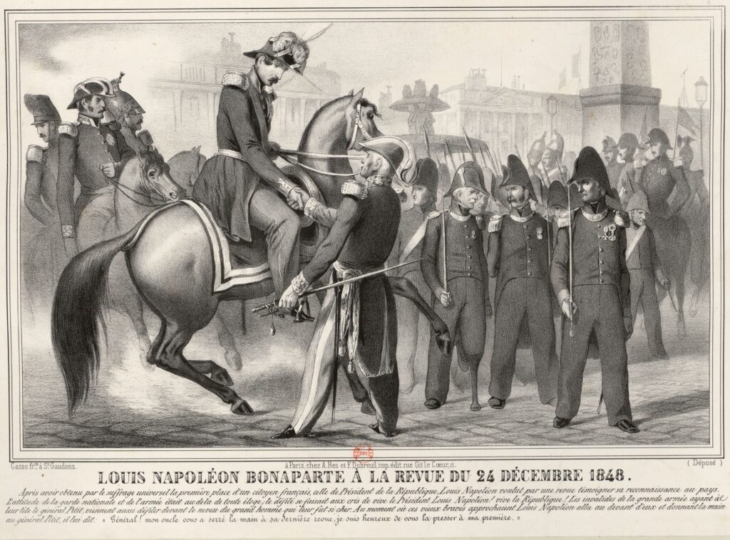 On December 24, 1848, Louis‑Napoléon Bonaparte — nephew of Napoleon Bonaparte — reviewed the National Guard as France’s newly elected president, a nation still unsteady from revolution watching its future take shape in disciplined ranks. Though this moment unfolded in Paris, its influence reached the United States: thousands of ‘Forty‑Eighters’ fleeing Europe’s upheavals carried their politics and ideals into American cities, helping shape labor movements, abolitionist circles, and the young Republican Party. And the Bonaparte name already had a foothold in America through Jérôme Bonaparte’s Baltimore family, whose descendants would one day help found the FBI. A winter scene in France, yet part of a story that touched both nations.