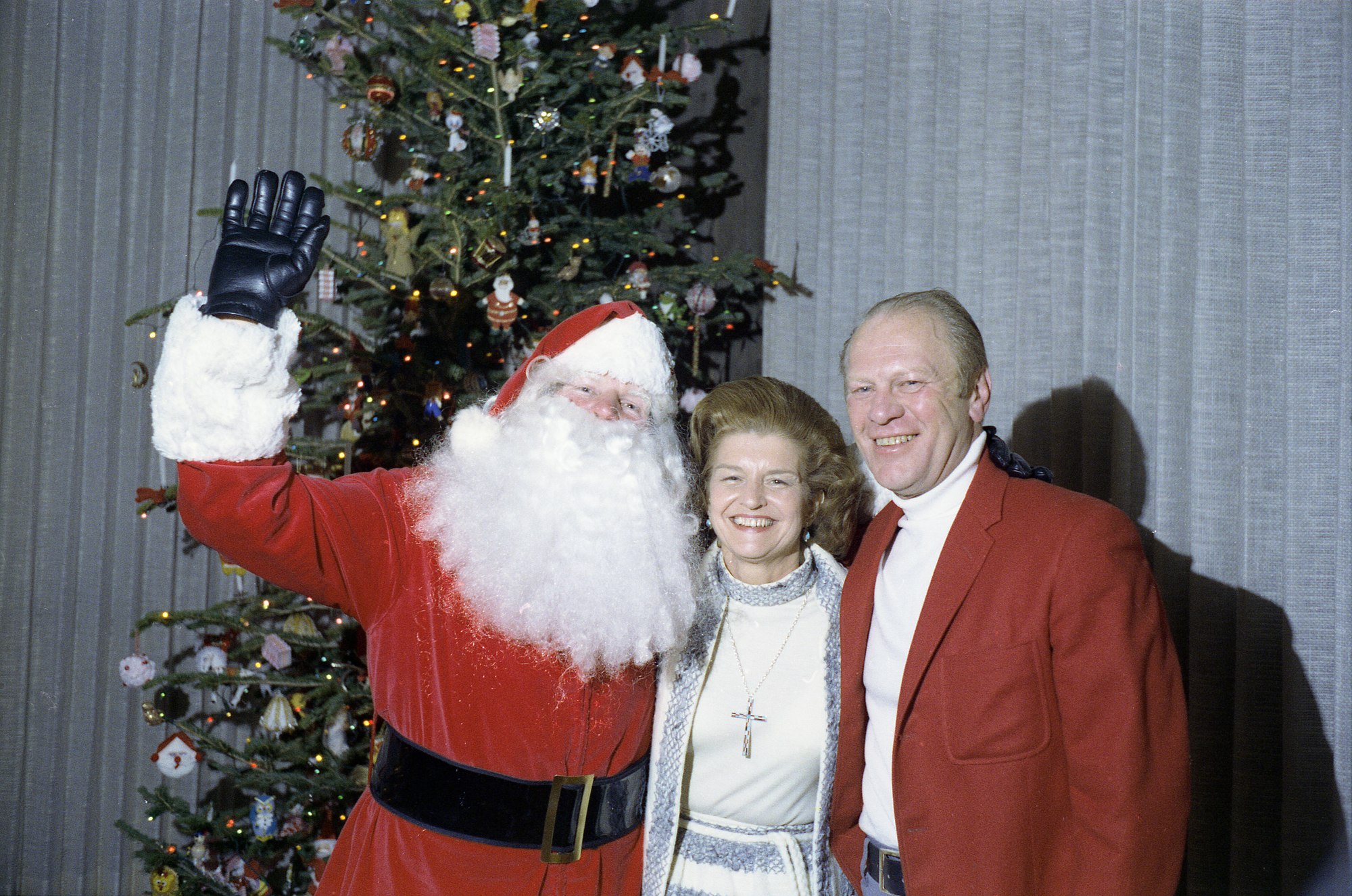 President Gerald R. Ford and First Lady Betty Ford Posing with Santa Claus during a Christmas Eve Party at the Kindel Residence in Vail, Colorado December 24, 1975 Photo via Wikimedia Commons, public domain