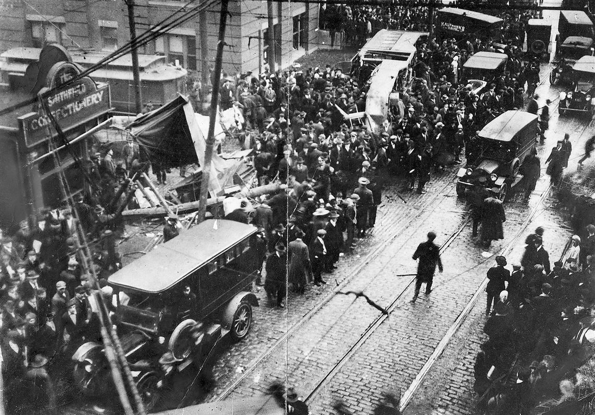 On December 24, 1917, a trolley car in Pittsburgh, carrying more than one hundred passengers, lost its brakes and overturned. 23 people were killed in the tragedy. Image via Wikimedia Commons, public domain in the US