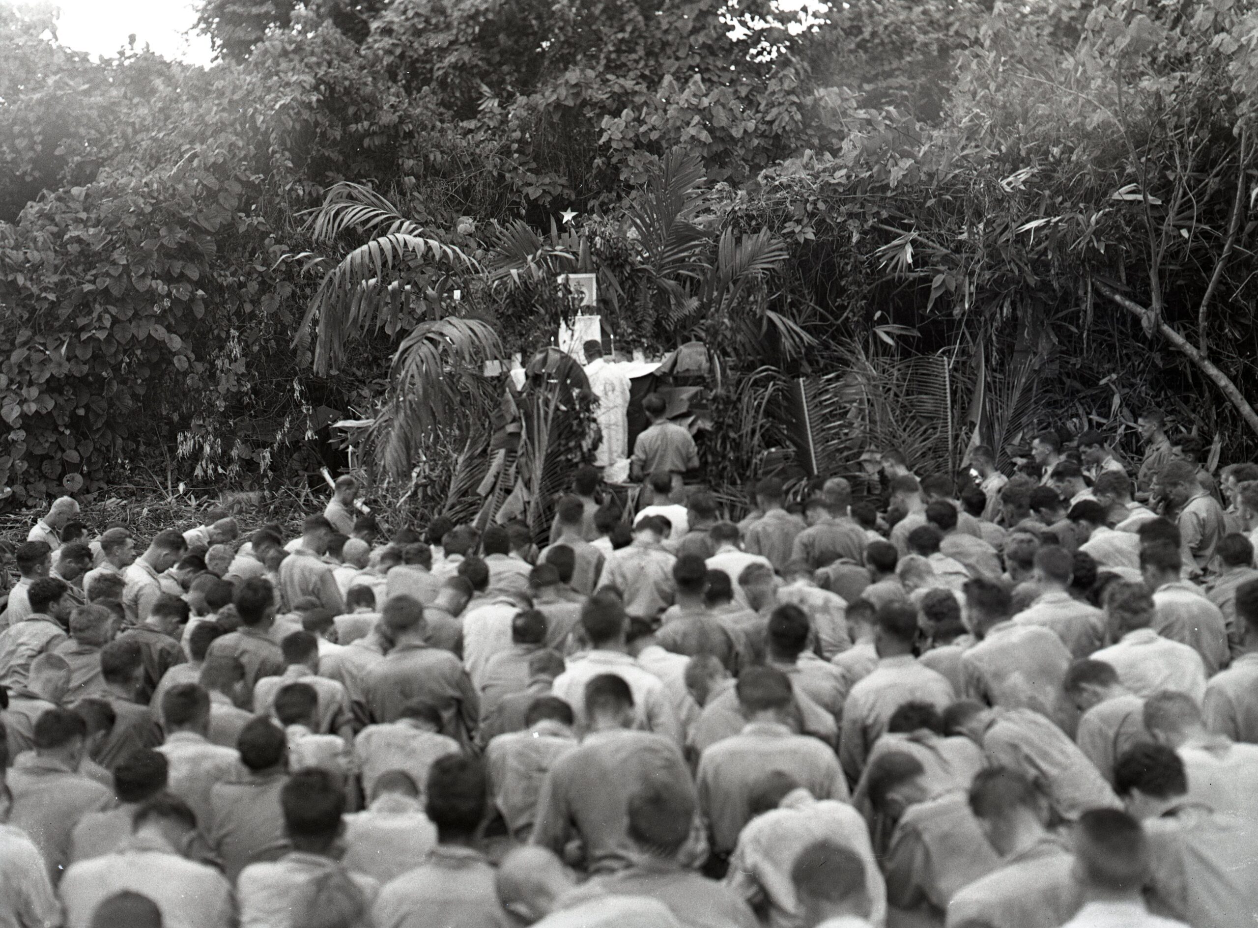 “Christmas Eve…Marines, on the eve of the invasion of Cape Gloucester, attend Christmas church services on a South Pacific island.” December 24, 1943 via Wikimedia Commons, public domain
