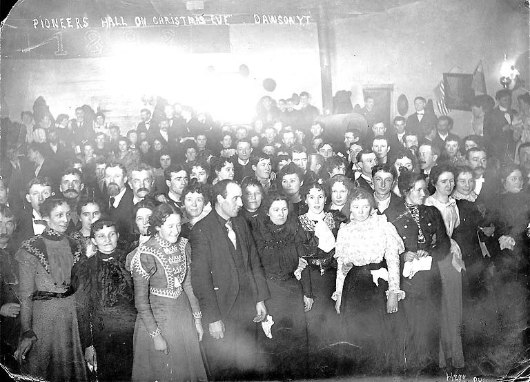 Men and women celebrating Christmas Eve in Pioneer Hall, Dawson, Yukon Territory, ca 1899 While people from all over the globe participated in the Klondike Gold Rush, up to 80% of all prospectors were from America. Photo by Swedish-American photographer Eric A. Hegg via Wikimedia Commons, public domain