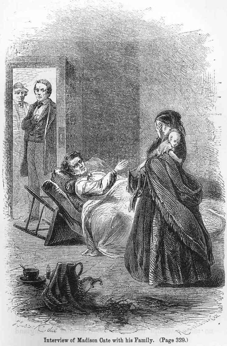 We have all just witnessed a thrilling scene. The wife of poor Cate came and presented herself in front of the jail, neatly attired, with an infant at her breast, of five or six weeks old, — born, I think, since her husband’s confinement! She asked leave to see her dying husband, but was refused at the door, by some one claiming to act upon authority. I put my head out of the window and remonstrated, telling them that it was a sin and a shame to refuse this poor woman, after coming so far, the liberty of seeing her husband, and seeing him for the last time! They allowed her to enter, but limited her stay to twenty minutes. She came in. And, oh, my soul ! what a scene ! Seeing the emaciated form of her husband on the floor, pining with sorrow and severe affliction, and destitute of every comfort, she approached with faltering step, and sank down upon his heaving breast, bathed in tears of anguish. I asked her to give me the babe as she ventured up ; for I saw that she was unconscious of having it in her arms. In that condition, without a word, they remained until her twenty minutes expired, of which being notified, she rose up and retired. I hope I may never look upon such a scene again.”