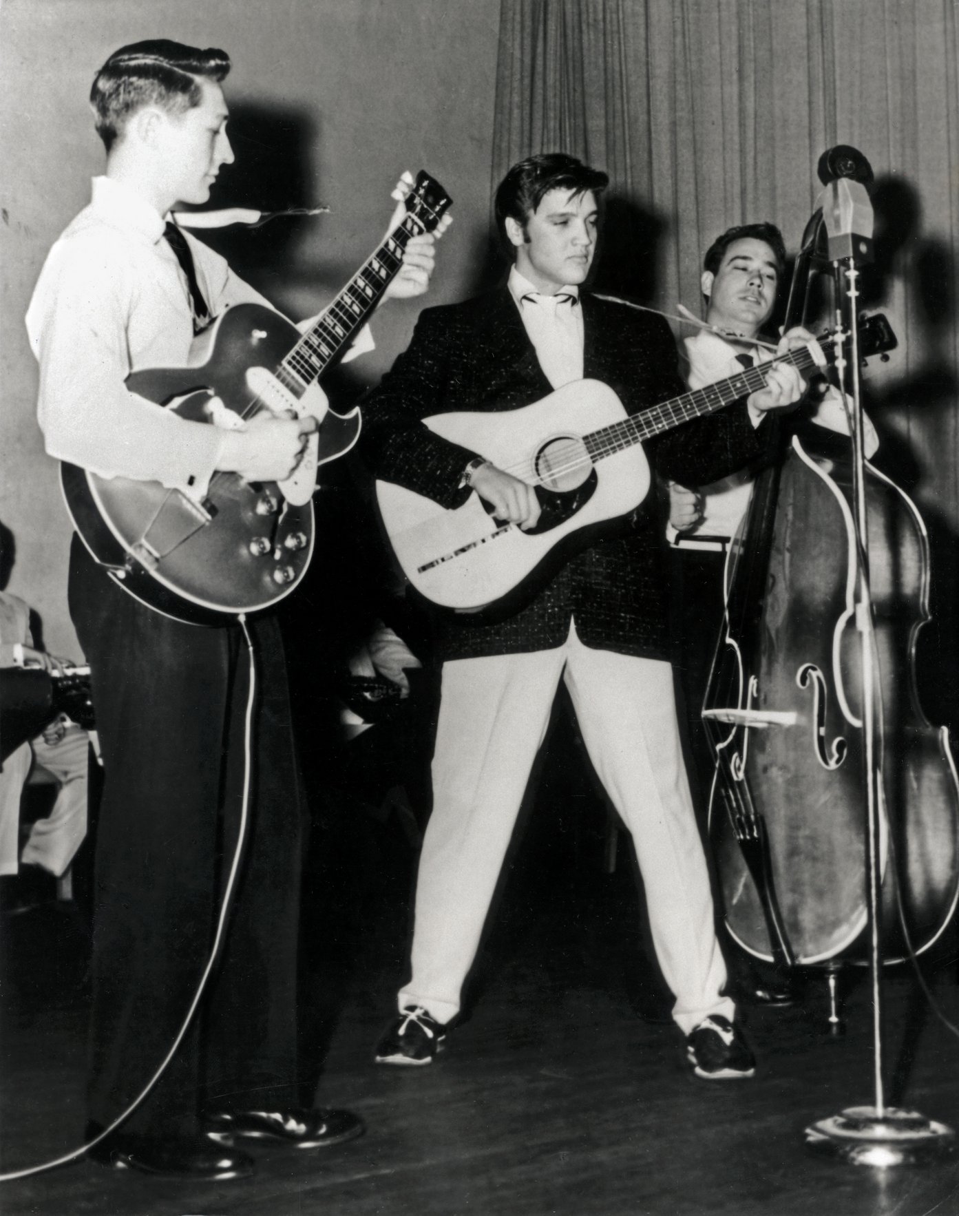 Elvis with the Blue Moon Boys – Scotty Moore (at left) and Bill Black on bass in 1957 via Alamy