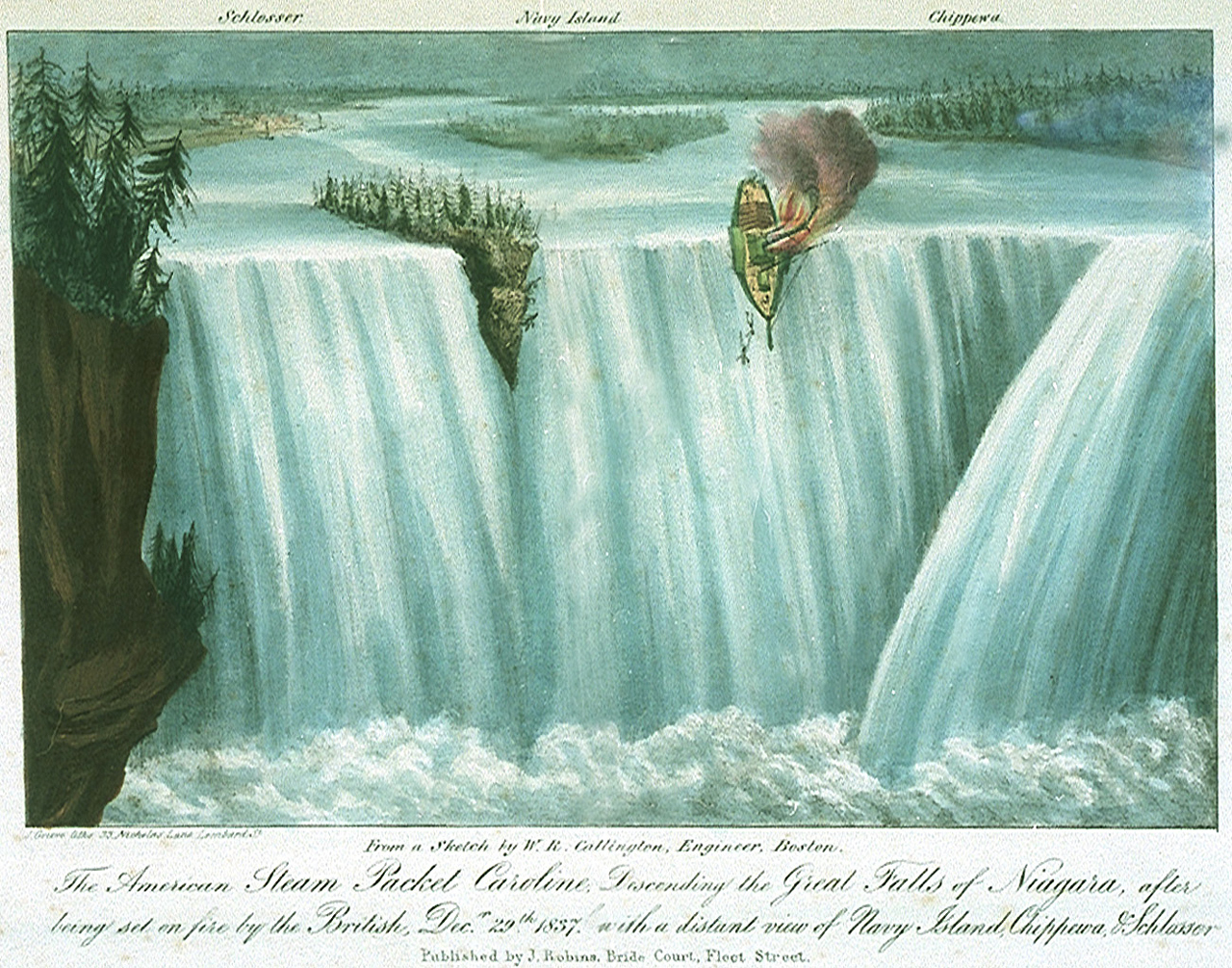 “The American Steam Packet Caroline Descending the Great Falls of Niagara, after being set on fire by the British, Decr. 29th 1837, with a distant view of Navy Island, Chippewa & Schlosser”