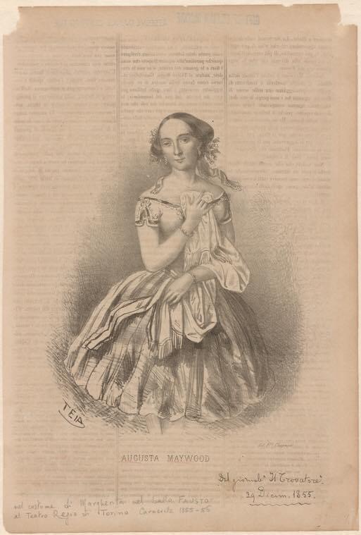 Newspaper clipping from December 29, 1855 showing a drawing of American ballerina Augusta Maywood.