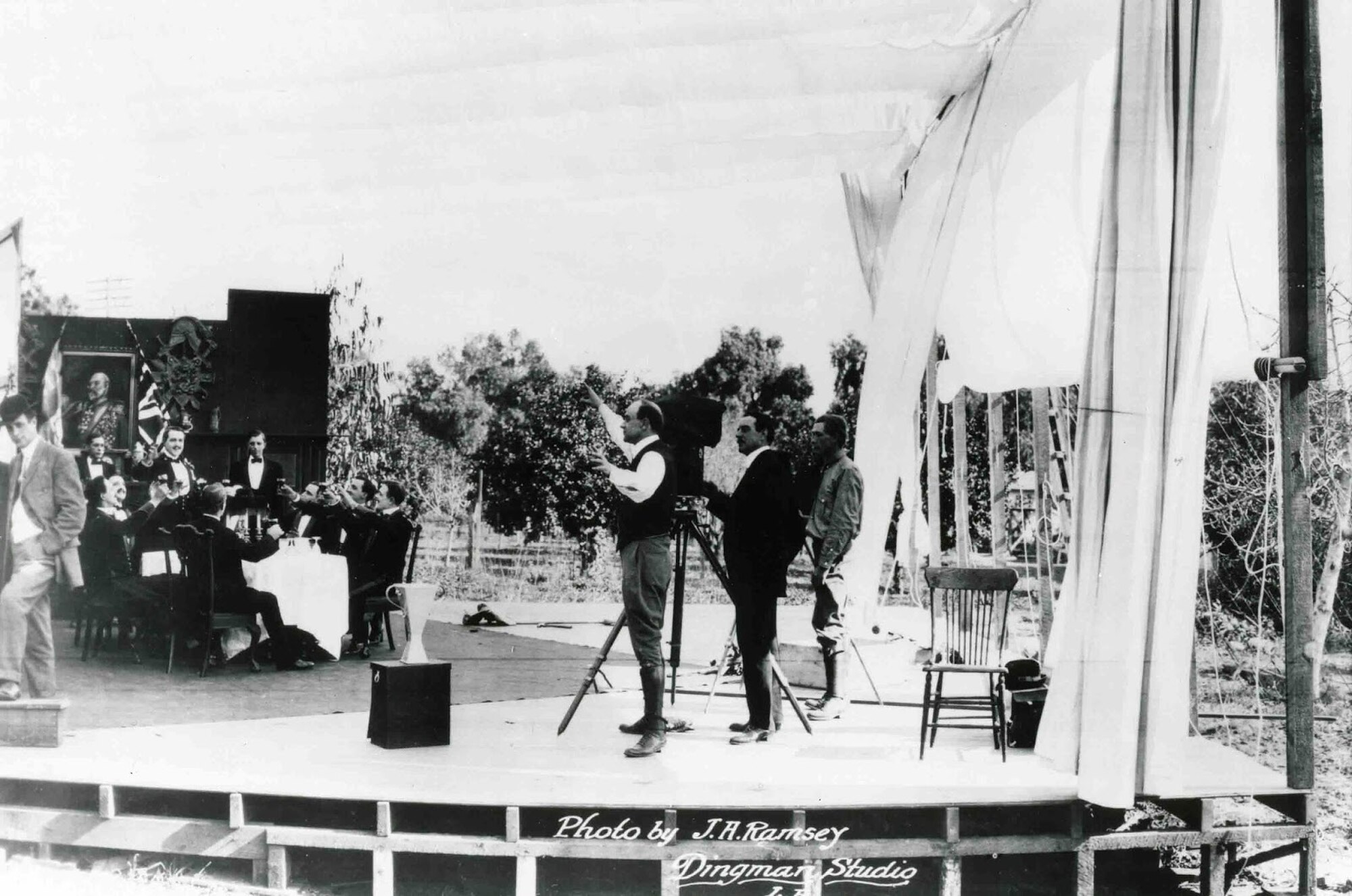 Image of the first sequence shooting of the film The Squaw Man in 1913. Cecil B. DeMille, director of the film, is in the center of the picture, wearing boots via Wikimedia Commons, public domain