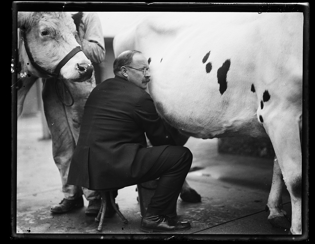 Photo that was taken of Senator Magnus Johnson milking a cow on December 29, 1923.