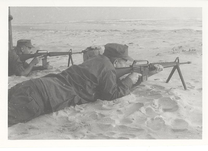 On December 30, 1967, USMC Colonel Edwin Reed, commanding officer of Marine Aircraft Group 16 practiced with his M-16 rifle Vietnam’s Marble Mountain Air Facility. Col. Reed’s unit was stationed at a helicopter base near Da Nang on the South China Sea.