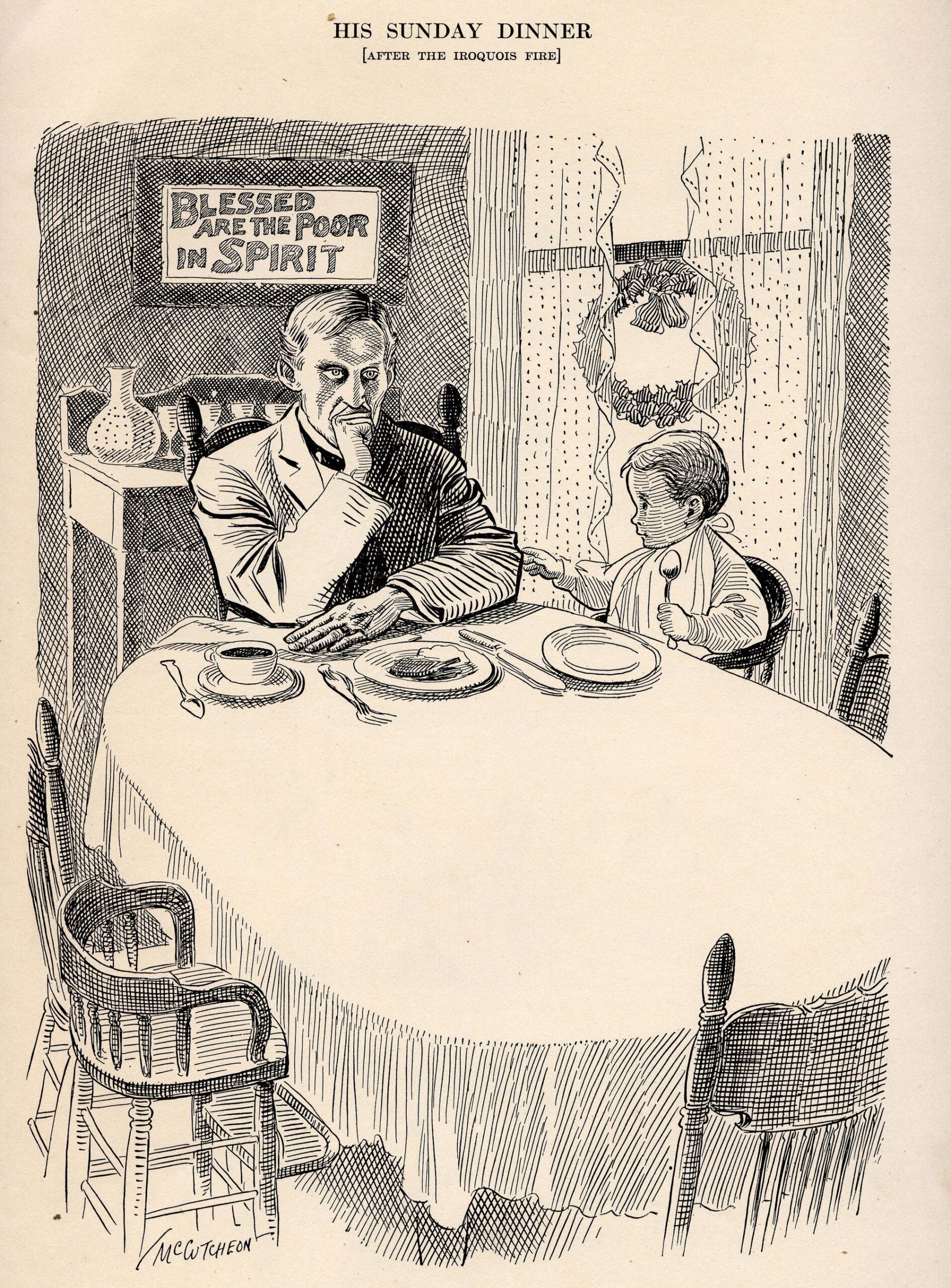 A heart-wrenching drawing of a father sitting with his only living child during the holidays after the Iroquois Theater fire in Chicago that took place on December 30, 1903 and claimed more than 600 lives.