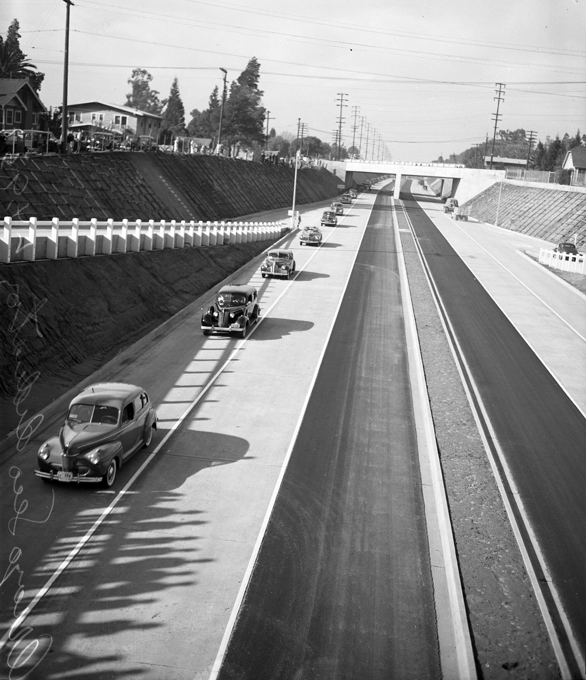 Automobiles travel down the Arroyo Seco on dedication day in Los Angeles on December 30, 1940.